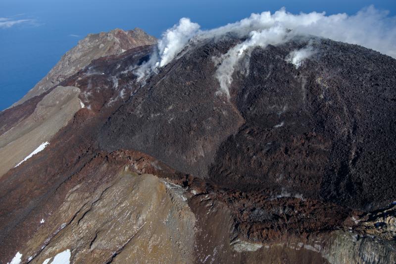Oblique view of Great Sitkin Volcano looking northeast the active lava flows in the crater. Photo taken on September 1, 2023 during a helicopter overflight by AVO geologists.