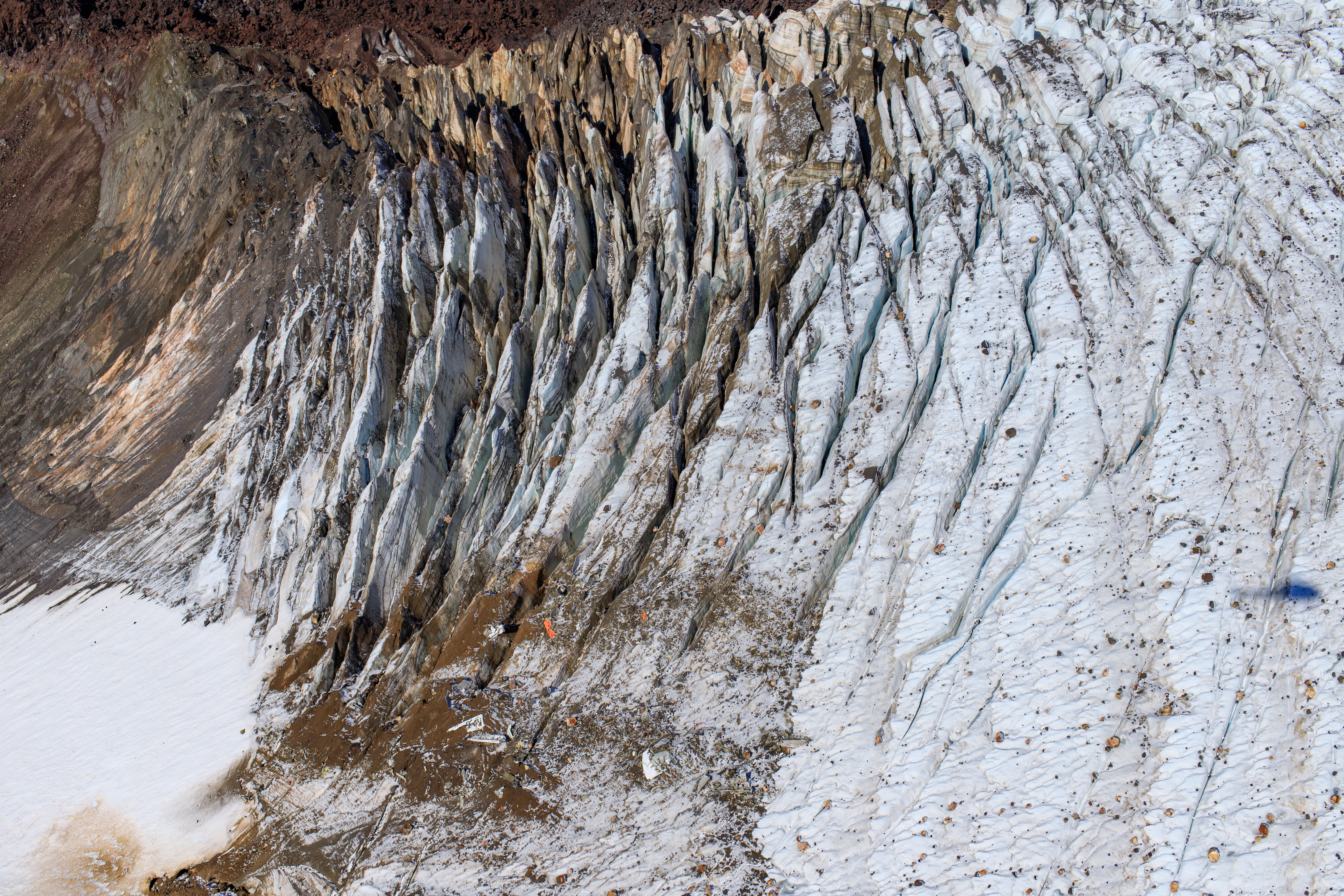Debris from old aircraft wreckage on the edge of the summit crater icefield of Great Sitkin taken on September 1, 2023. The wreckage is on the south side of the summit crater and east of the active lava flows.