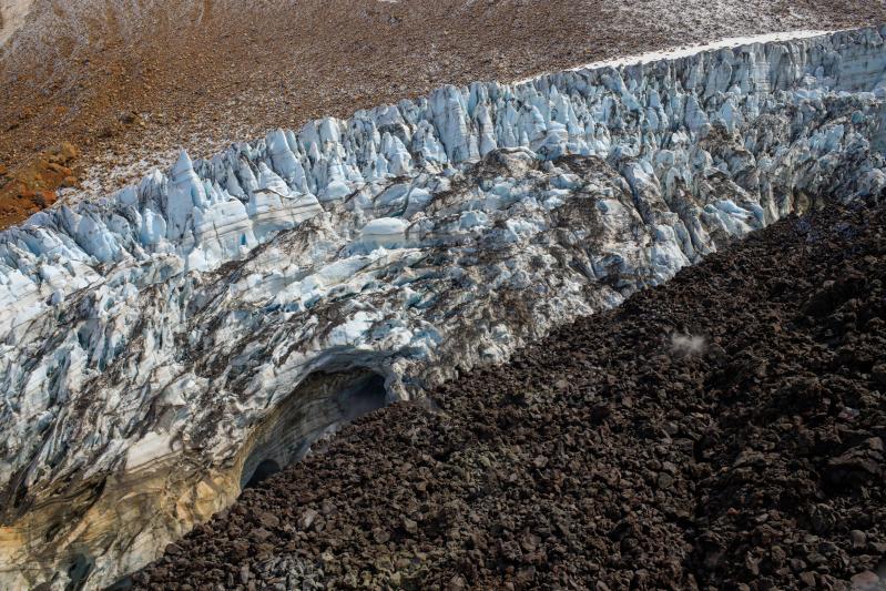 Lava-ice contact oblique view of the active east lobe of lava in the summit crater of Great Sitkin Volcano. Photo taken on September 1, 2023 during a helicopter overflight by AVO geologists.