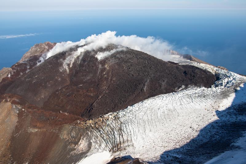 "Leading up to 2021, activity at Great Sitkin Volcano was characterized by years of precursory seismicity, elevated surface temperatures, and gas emissions. This unrest culminated with a Vulcanian explosion on May 25, 2021, an event successfully forecasted by AVO in the hours prior. An effusive eruption then began in mid-July, gradually filling both the 2021 explosion crater and much of the summit crater with lava, which then spilled down the volcano’s flanks. Lava effusion persisted at the volcano throughout the rest of the year. The 2021 eruption followed the pattern of the 1974 eruption: an explosive event followed by lava effusion in the summit crater. AVO crews visited the volcano in June 2021 to sample the explosive eruption deposits and to carry out a gas and airborne imaging survey.