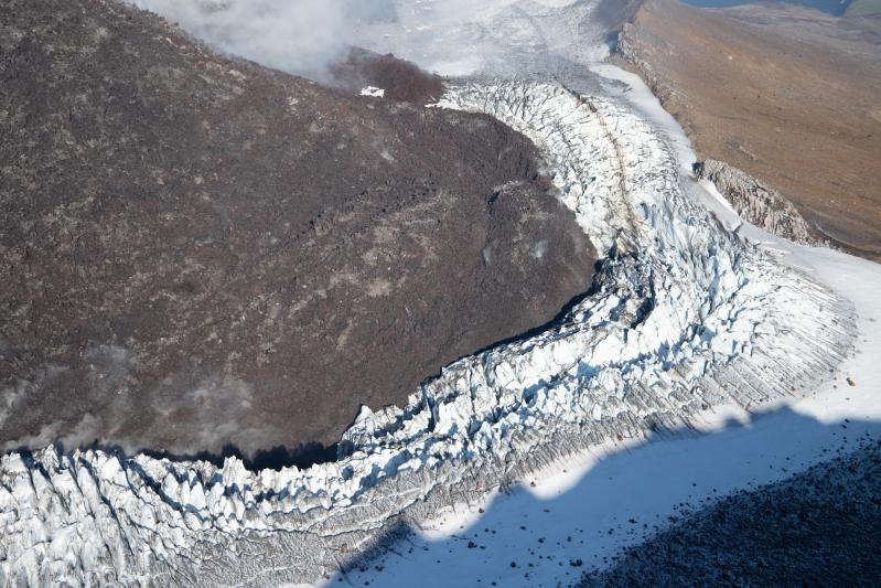 The active lava flows into and deforms the glacier within the summit crater of Great Sitkin Volcano on September 1, 2023. Photograph is from a helicopter overflight for imaging and sampling of the lava flow by AVO geologists. View is to the northwest of the active toe of the eastern lava flow lobe.