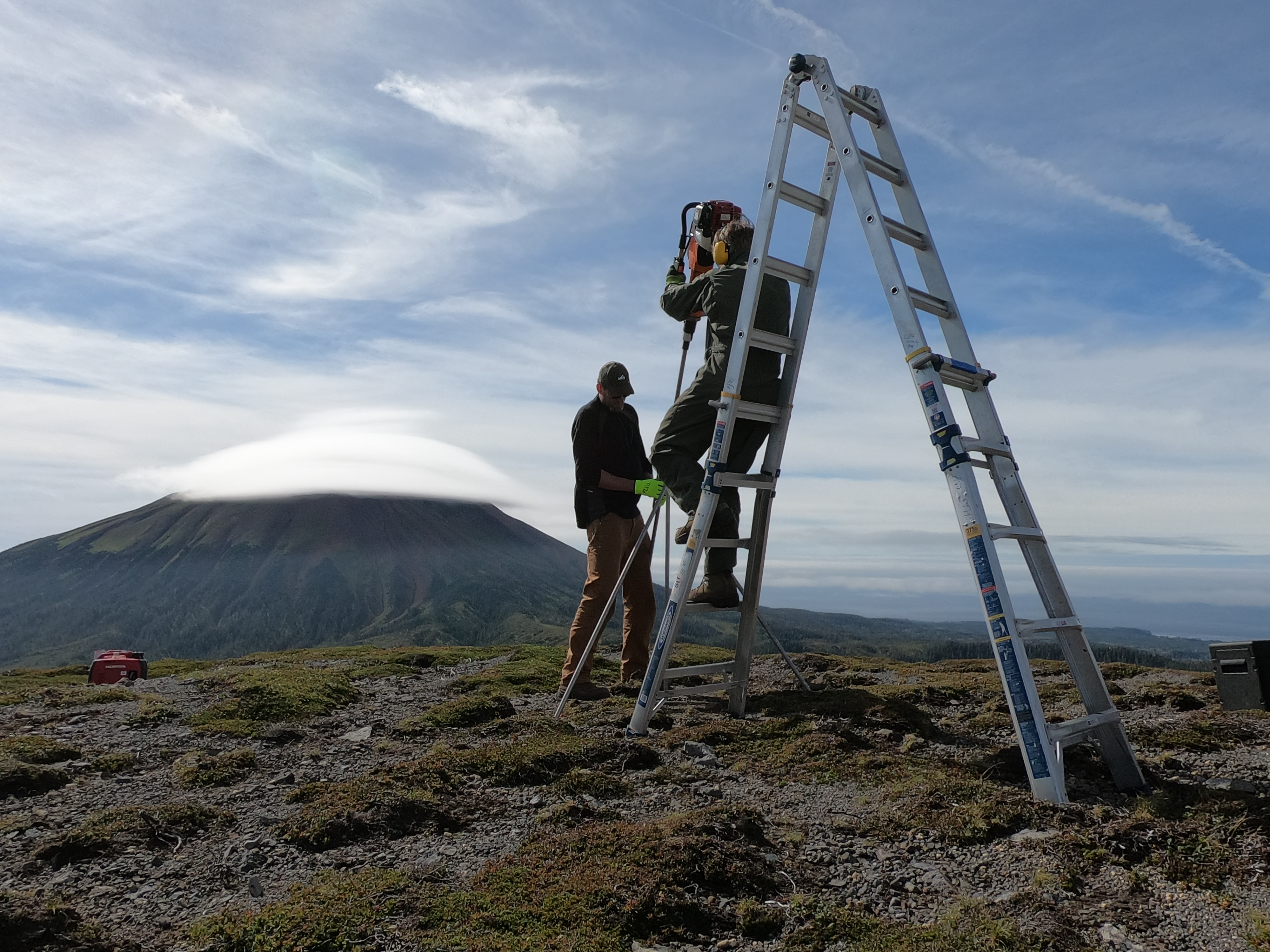 Installation of AVO's new seismic and GNSS network at Mt. Edgecumbe volcano, August 20-29 2023. AVO field technician Max Kaufman and UAF Geodesy professor Ronni Grapenthin construct a new GNSS antenna monument at site EDCR on Crater Ridge. 12 ft long by 1" stainless steel rods are driven 7 ft into the ground, and welded together at the top. Mt Edgecumbe sits in the background with a nice lenticular cloud cap.