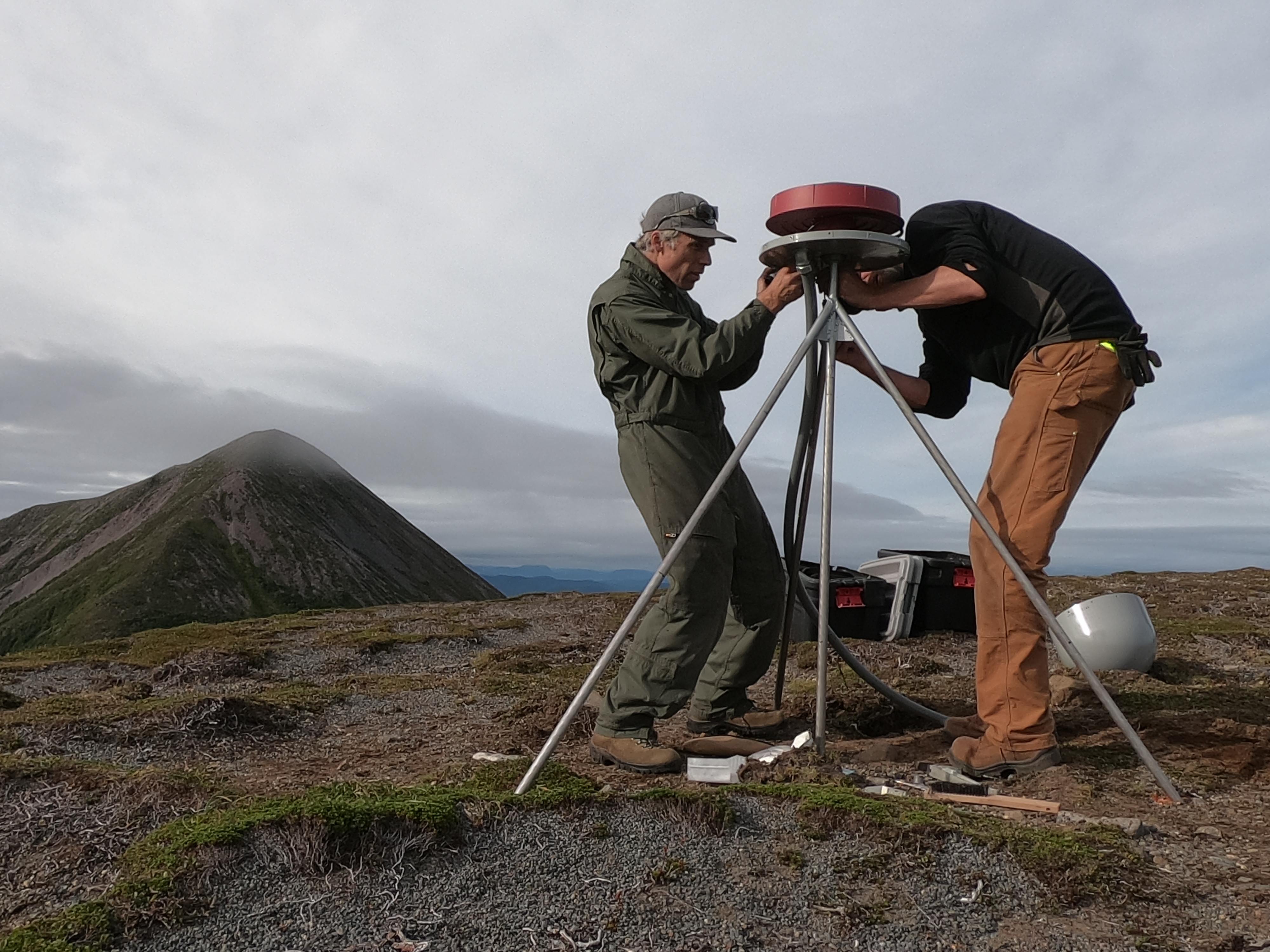 Installation of AVO's new seismic and GNSS network at Mt. Edgecumbe volcano, August 20-29 2023.  AVO field technician Max Kaufman and UAF Geodesy professor Ronni Grapenthin install a GNSS antenna at the pre-existing AVO station EDCR on Crater Ridge, north of Mt Edgecumbe.