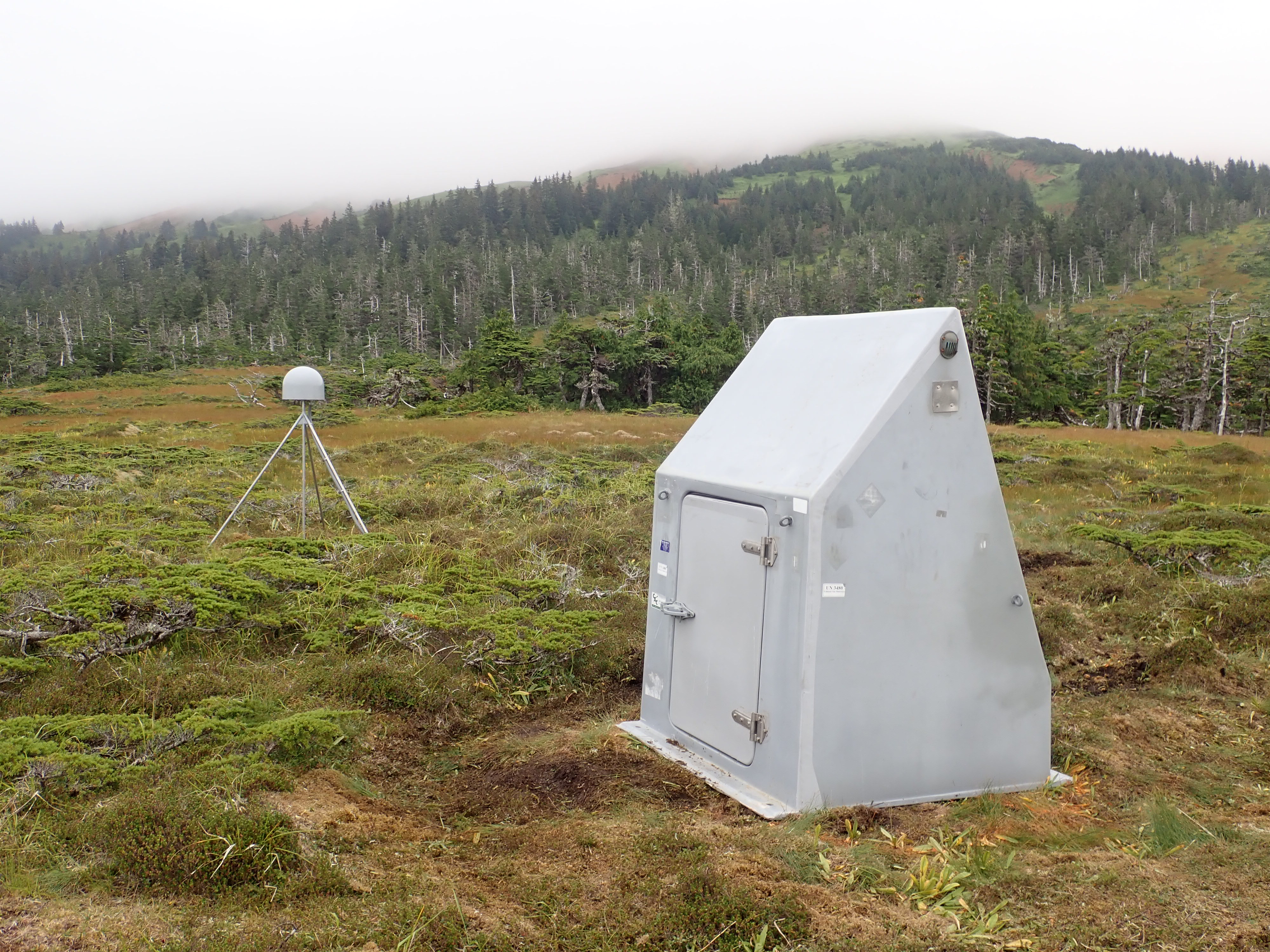 Installation of AVO's new seismic and GNSS network at Mt. Edgecumbe volcano, August 20-29 2023. EDNW is an autonomously powered seismic and GNSS station. GNSS antenna monument at site EDNW made of 12 ft by 1" stainless steel rods driven 7 ft into the muskeg, and welded together at the top.