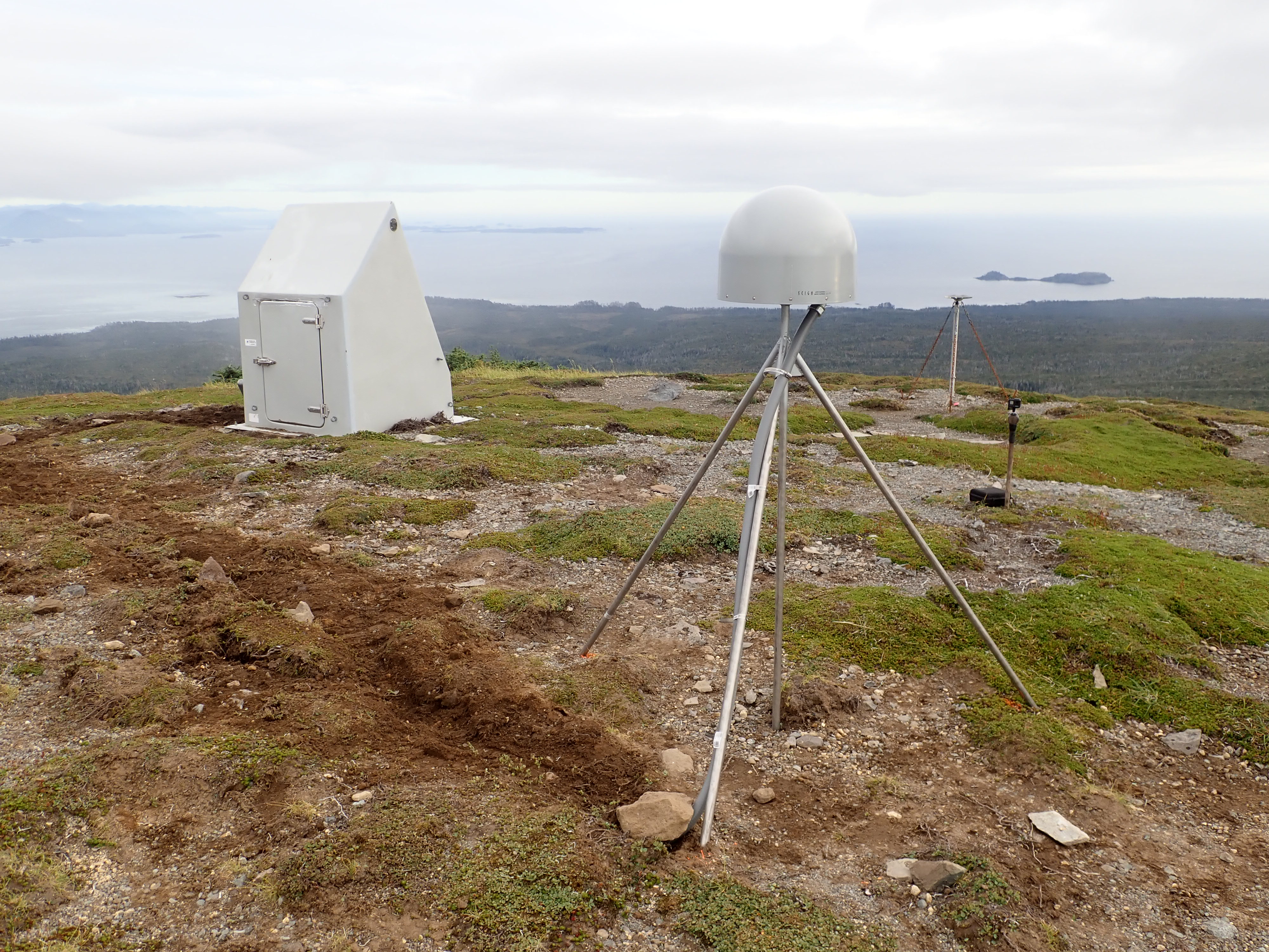 Installation of AVO's new seismic and GNSS network at Mt. Edgecumbe volcano, August 20-29 2023. Station EDCR on Crater Ridge, view to SE. The temporary GPS antenna mast in the back right was partially knocked over in the winter of 22-23, so we replaced it with a much more durable welded steel monument made of four 12 ft rods driven into the ground.