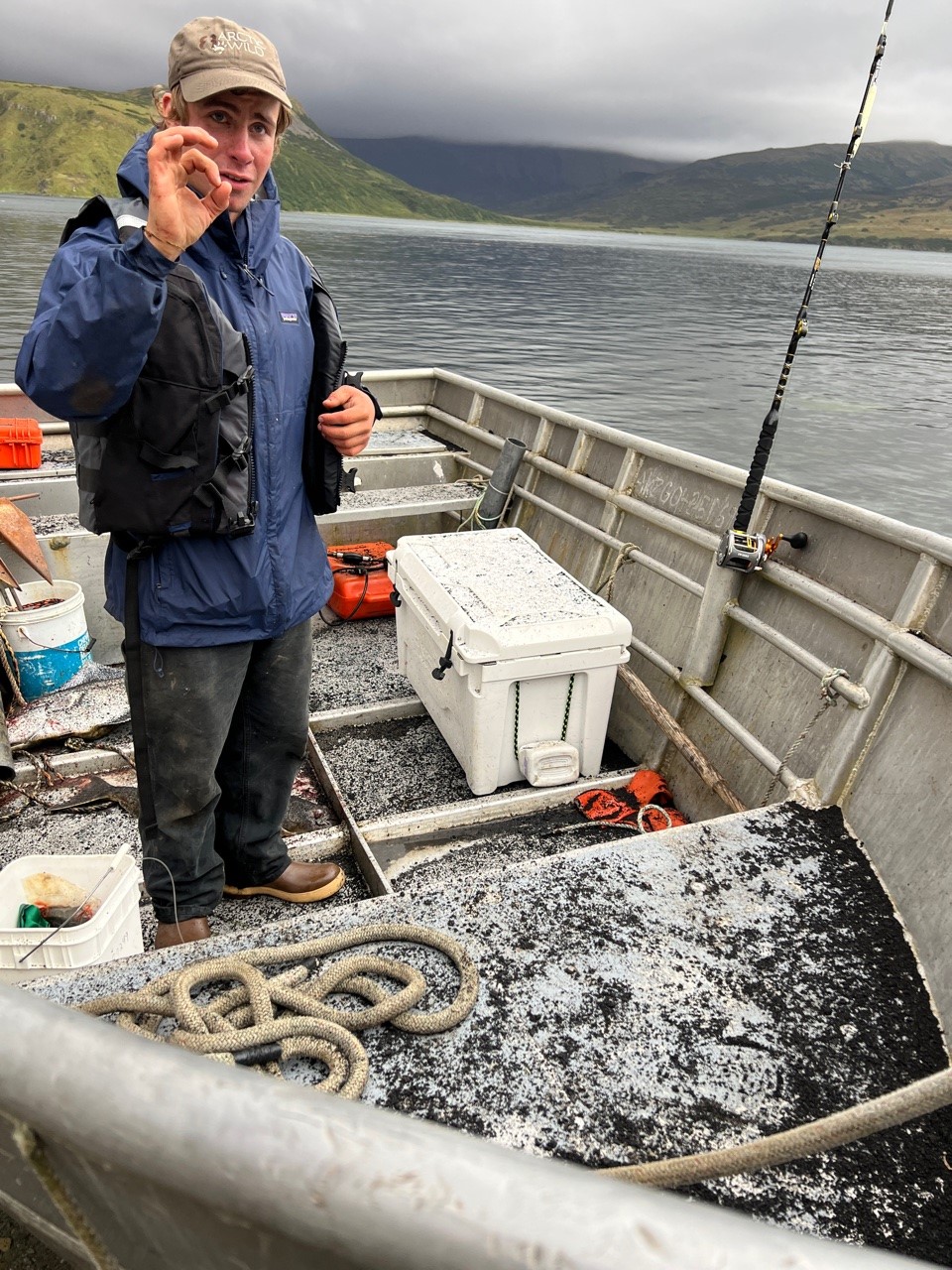 Ash and lapilli from Shishaldin Volcano on September 15, 2023 on an open skiff boat in Ikatan Bay, near False Pass, Alaska. Leo Wald is demonstrating with his fingers, the size of the largest scoria clasts that fell on their boat while in Ikatan Bay fishing. Photo by Sally Andersen.