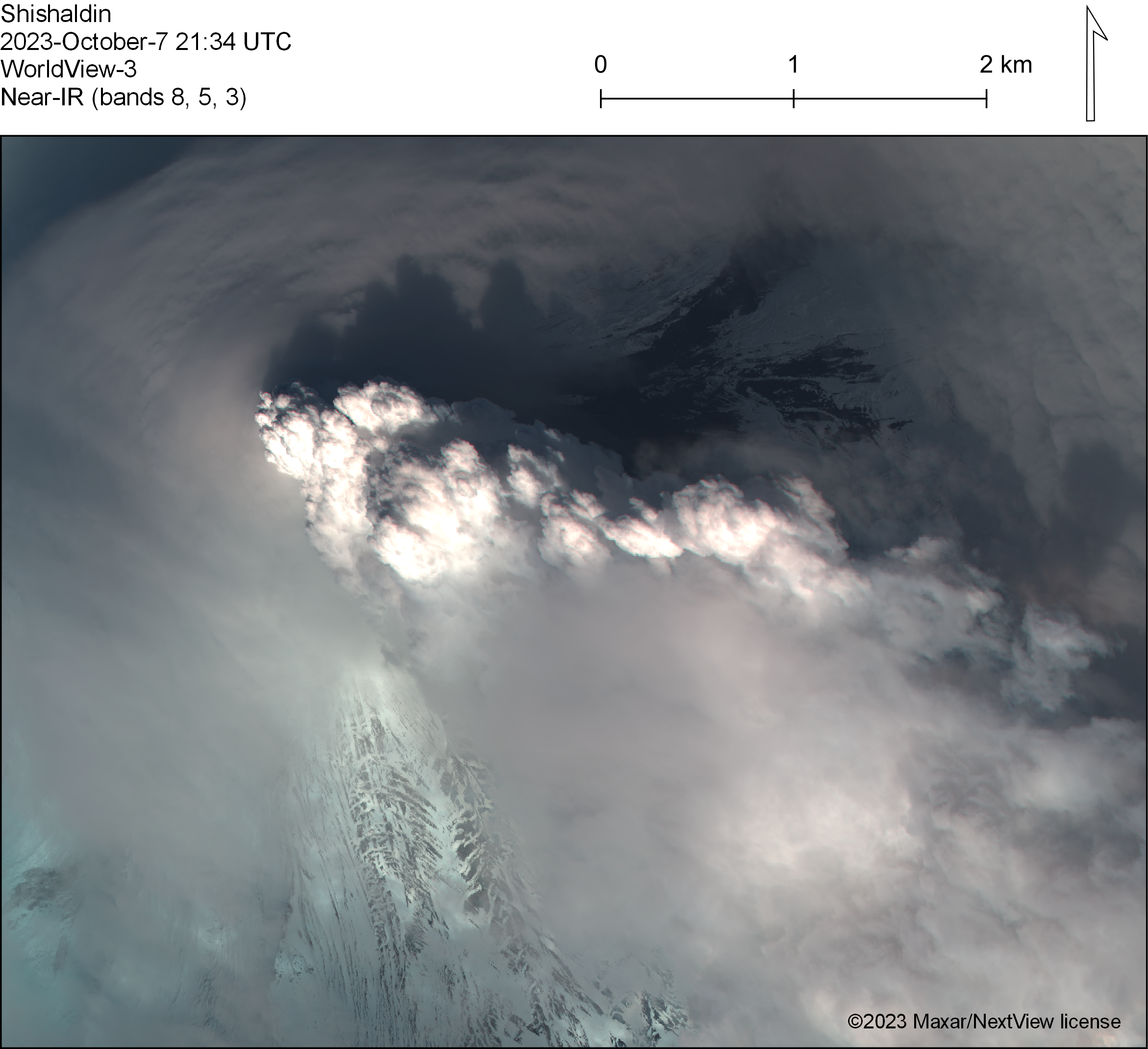 Steam and gas plume visible above low clouds at Shishaldin Volcano on October 7, 2023, from a near-infrared WorldView-3 satellite image. Pyroclastic deposits from October 3 are visible to the northeast of the steam plume.