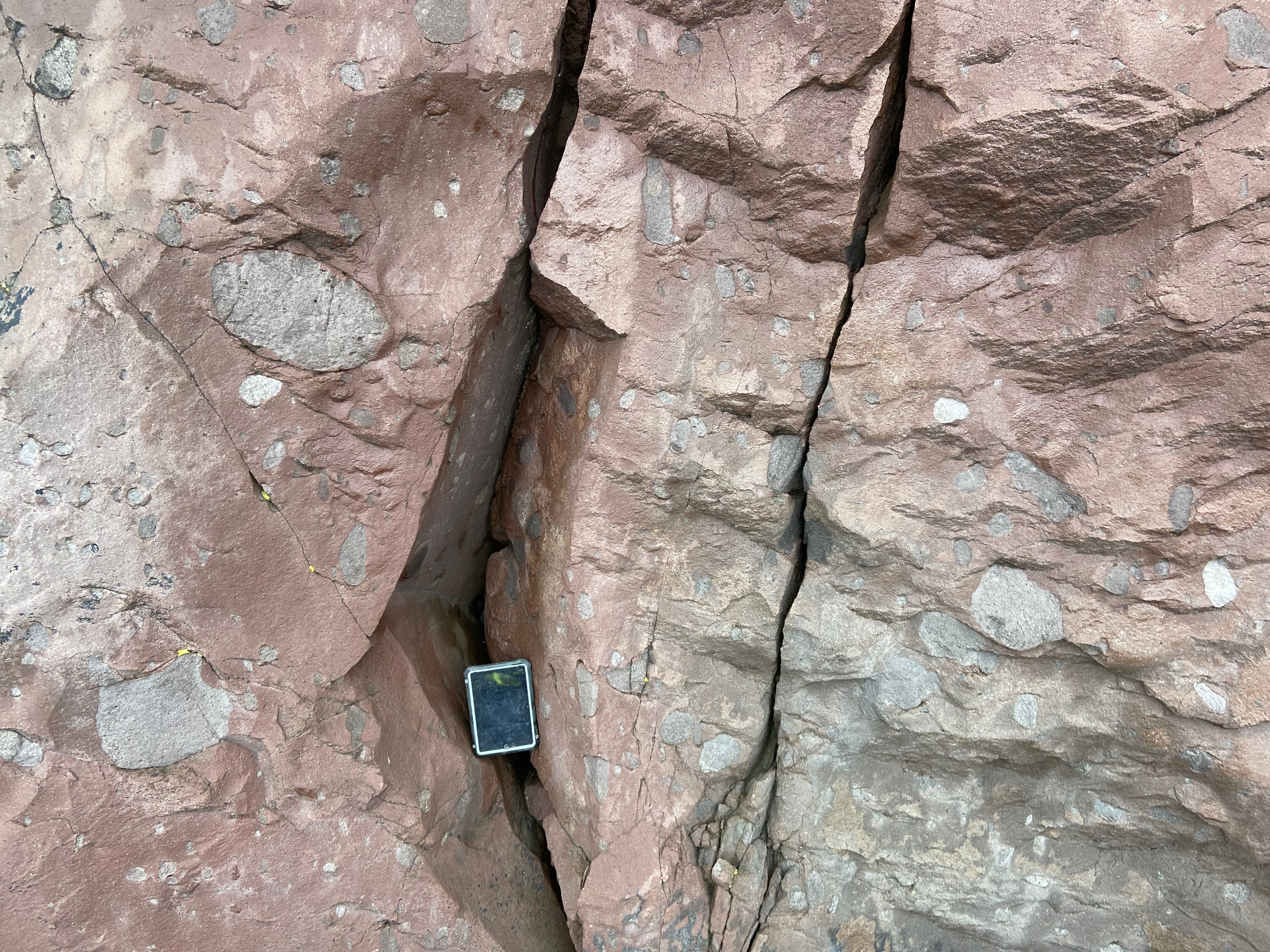 Abundant enclaves exposed in rock face on north shore of Adagdak volcano (just beyond the former Loren station). 20 cm long tablet for scale.
