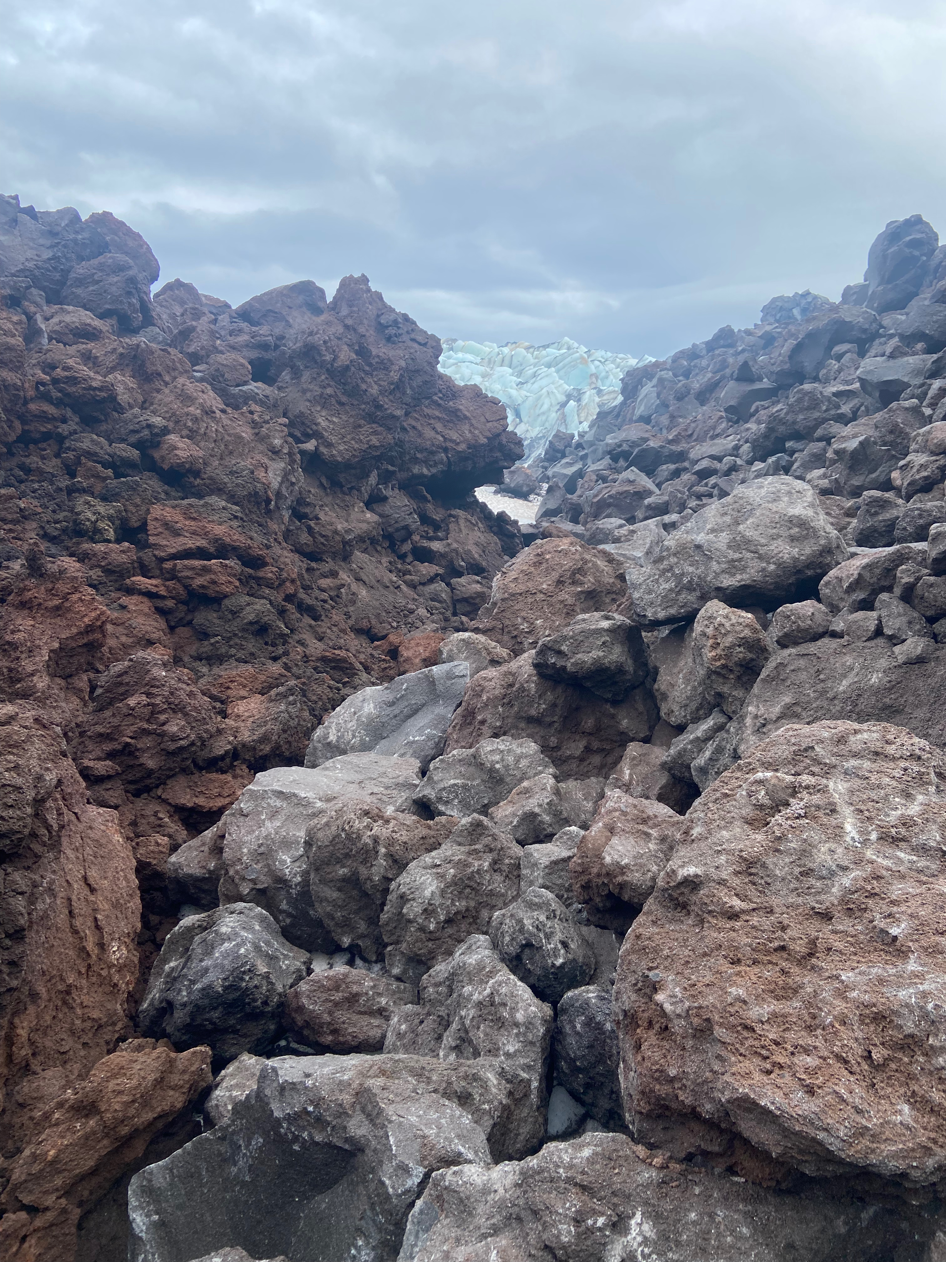 Margin between the active (right, light gray) and inactive older (left, reddish hue) lava flow lobes on Great Sitkin looking towards the lava-ice contact (upper center).