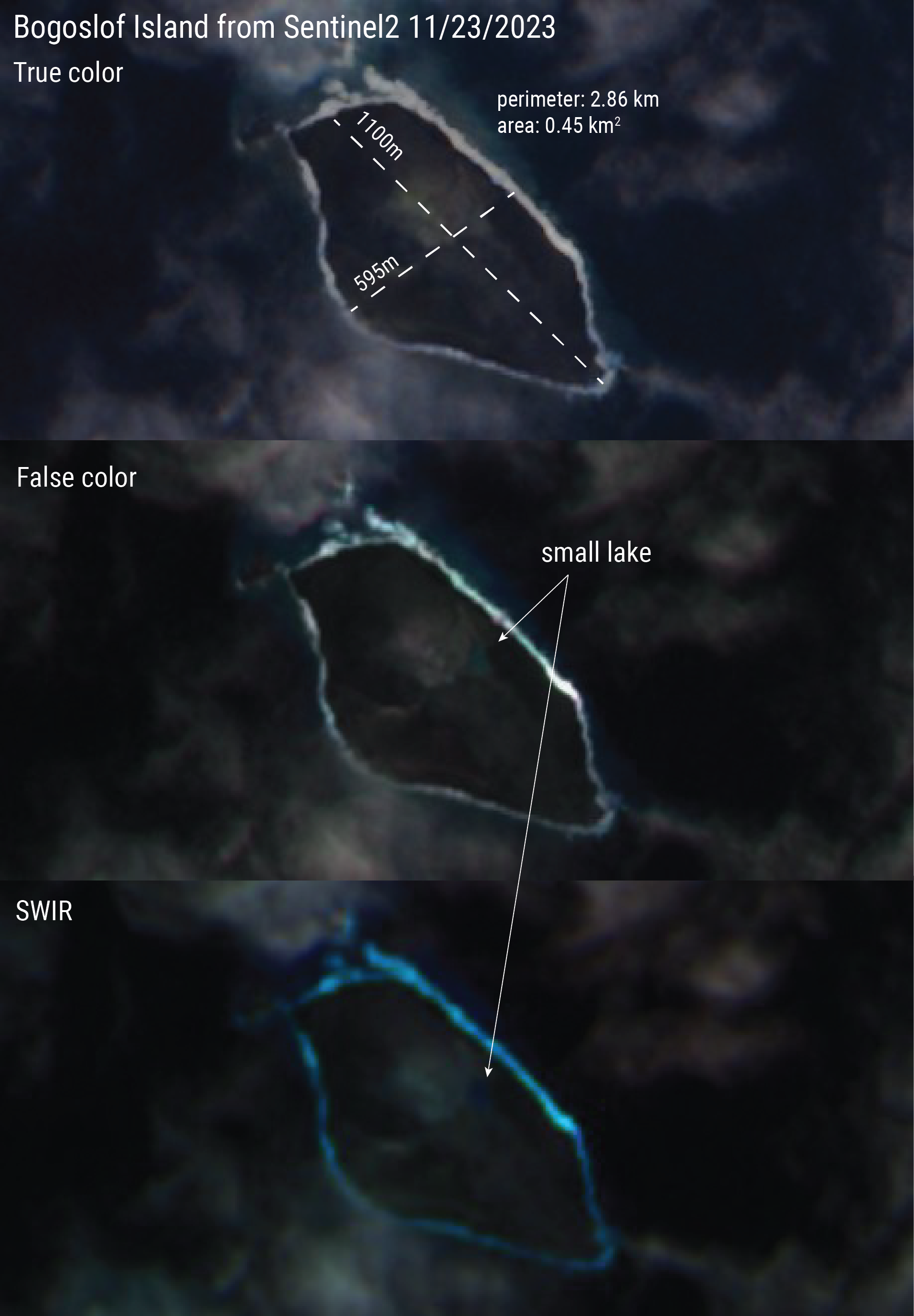 Annotated European Space Agency Sentinel-2 satellite imagery of Bogoslof Island (top: true color from bands 4,3,2; middle: false color from bands 8,4,3; bottom: short-wave infrared from bands 12, 8A, 4) showing no signs of volcanic unrest or signficiant surface changes since a seismic swarm that started on Oct 22 near the island has since subsided.