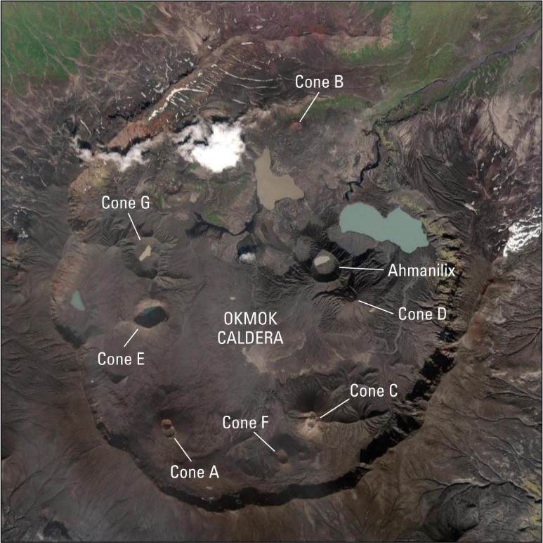 Satellite image of Mount Okmok in the eastern Aleutian Islands, Alaska, showing its caldera and intracaldera cones. Copyright 2021 Google Earth, Maxar Technologies.