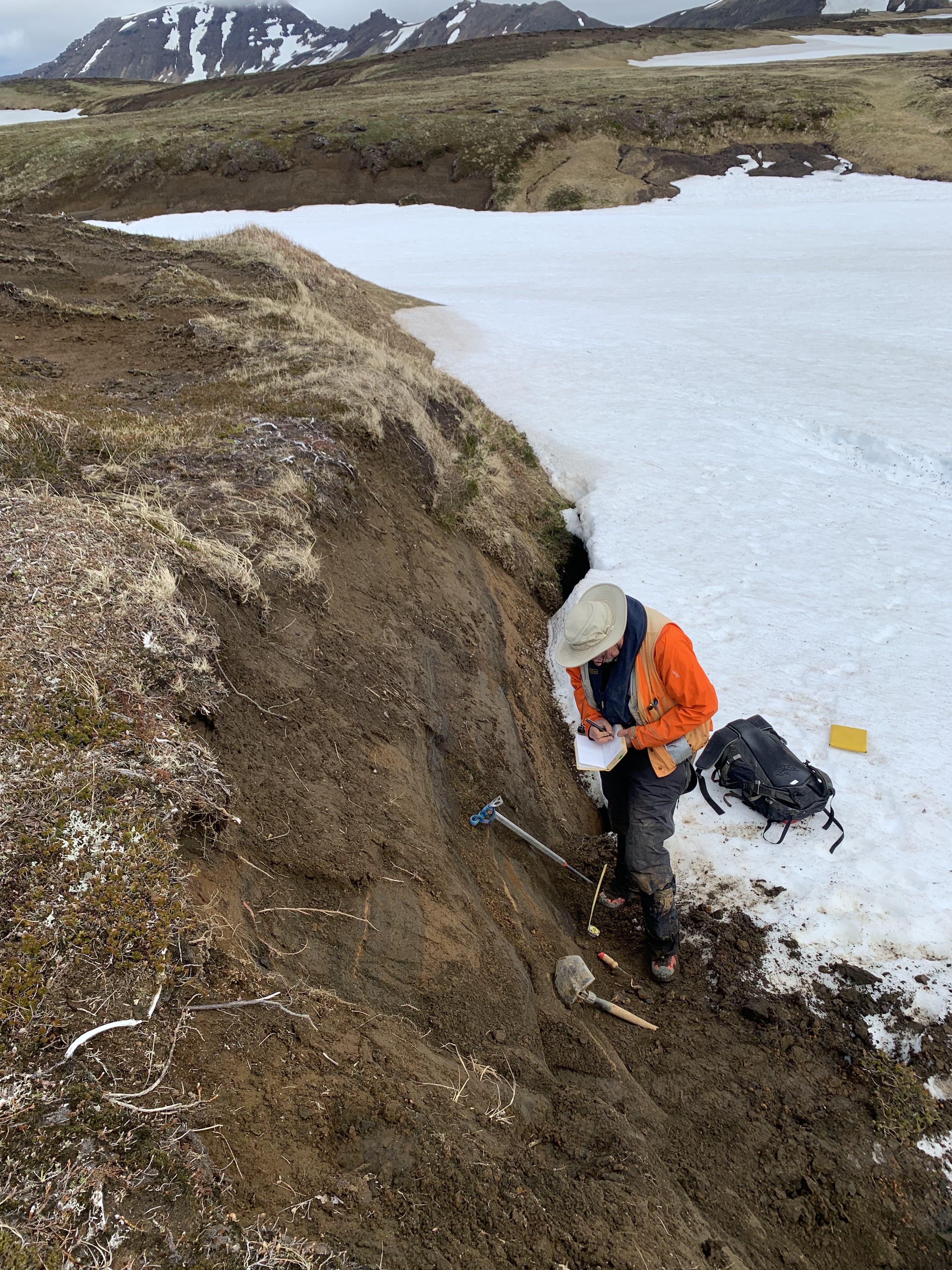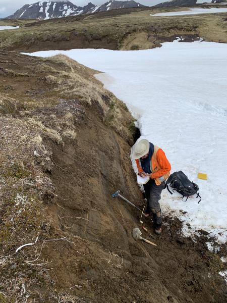 Photo of outcrop 24MKJFL583 near the base of Makushin volcano on a plateau geologists call the Lava Ramp. Jim Vallance (USGS-CVO) is working on ash layers from Makushin and Akutan volcano while standing on snow that fills the stream channel.
