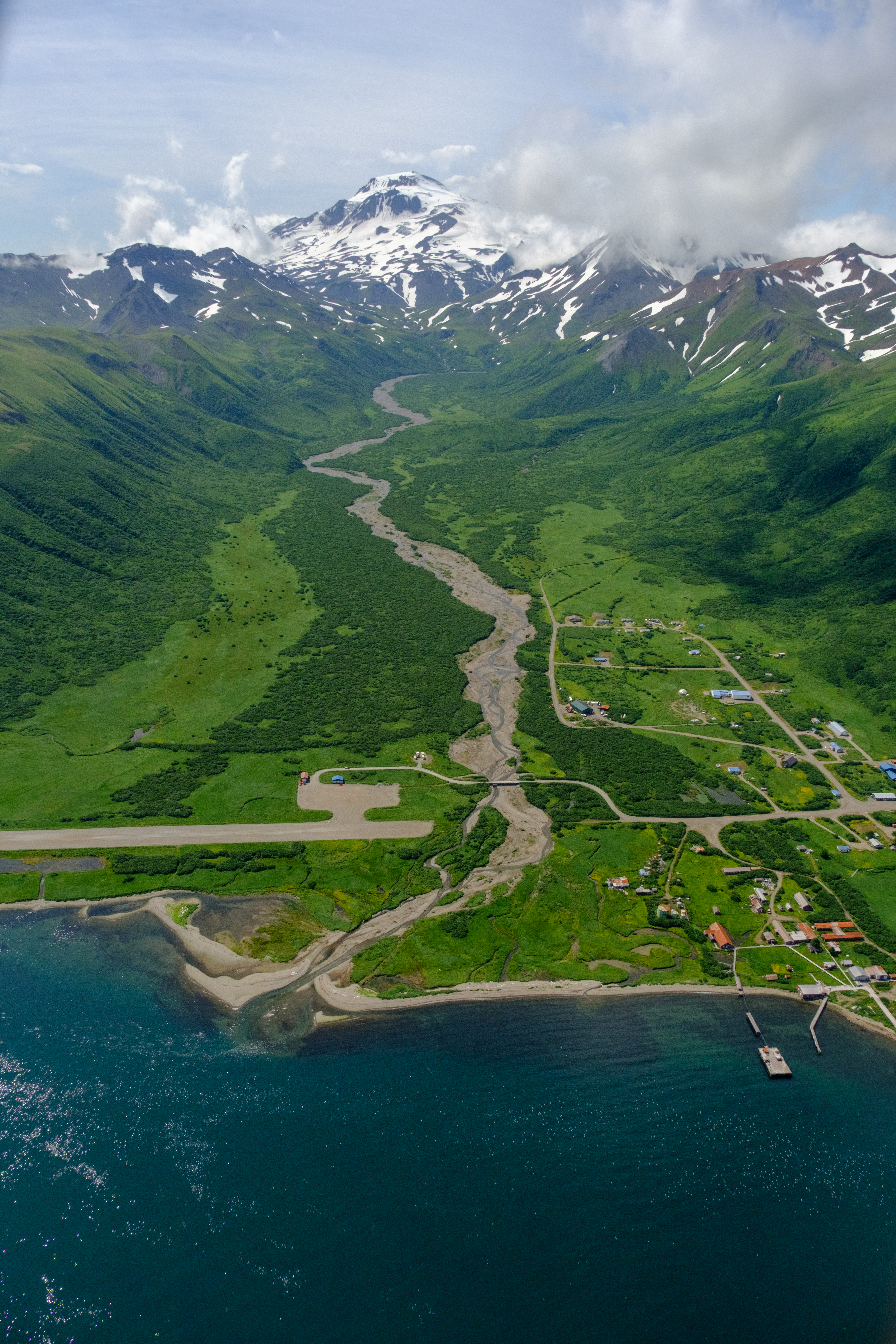 False Pass, Alaska, with Roundtop Mountain visible at the head of the valley above the community.