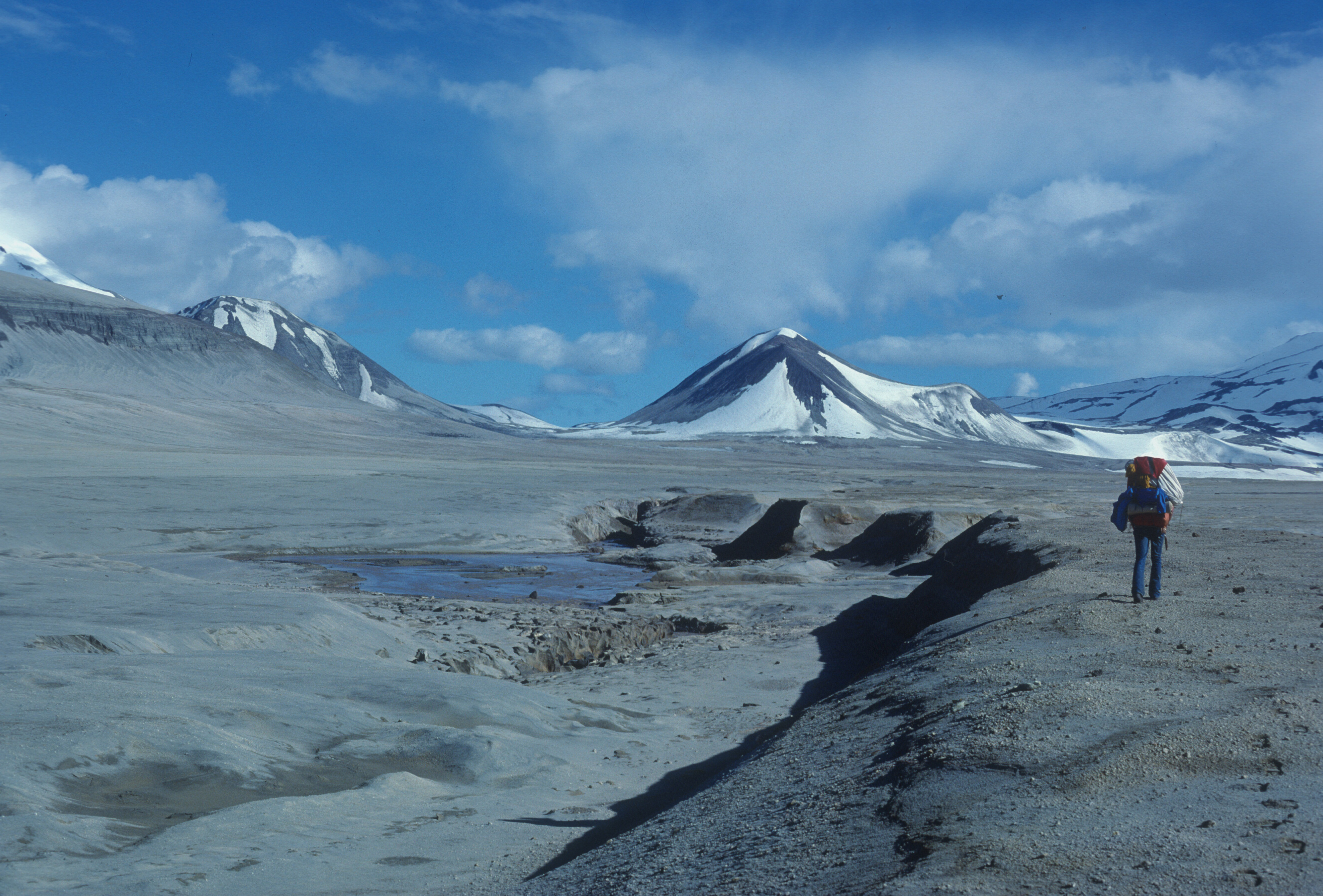 Katmai Pass. River Lethe snow-filled. Just below ford. Snow pumice-covered.