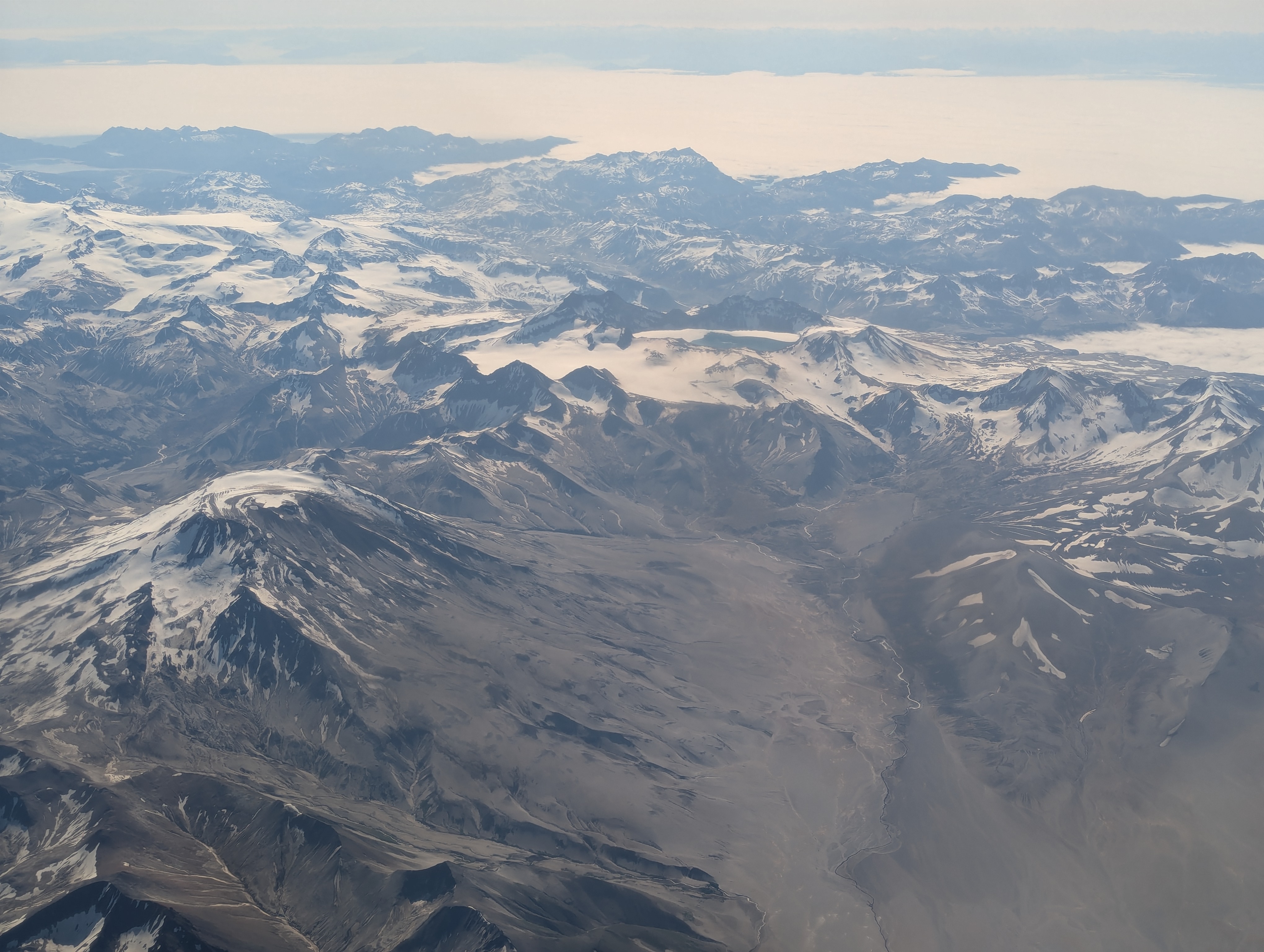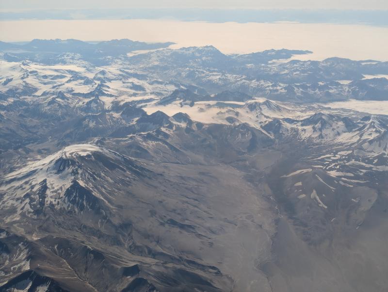 View of Griggs and Katmai Volcanoes from the north, en route to Cold Bay aboard a commercial flight on July 22, 2024.