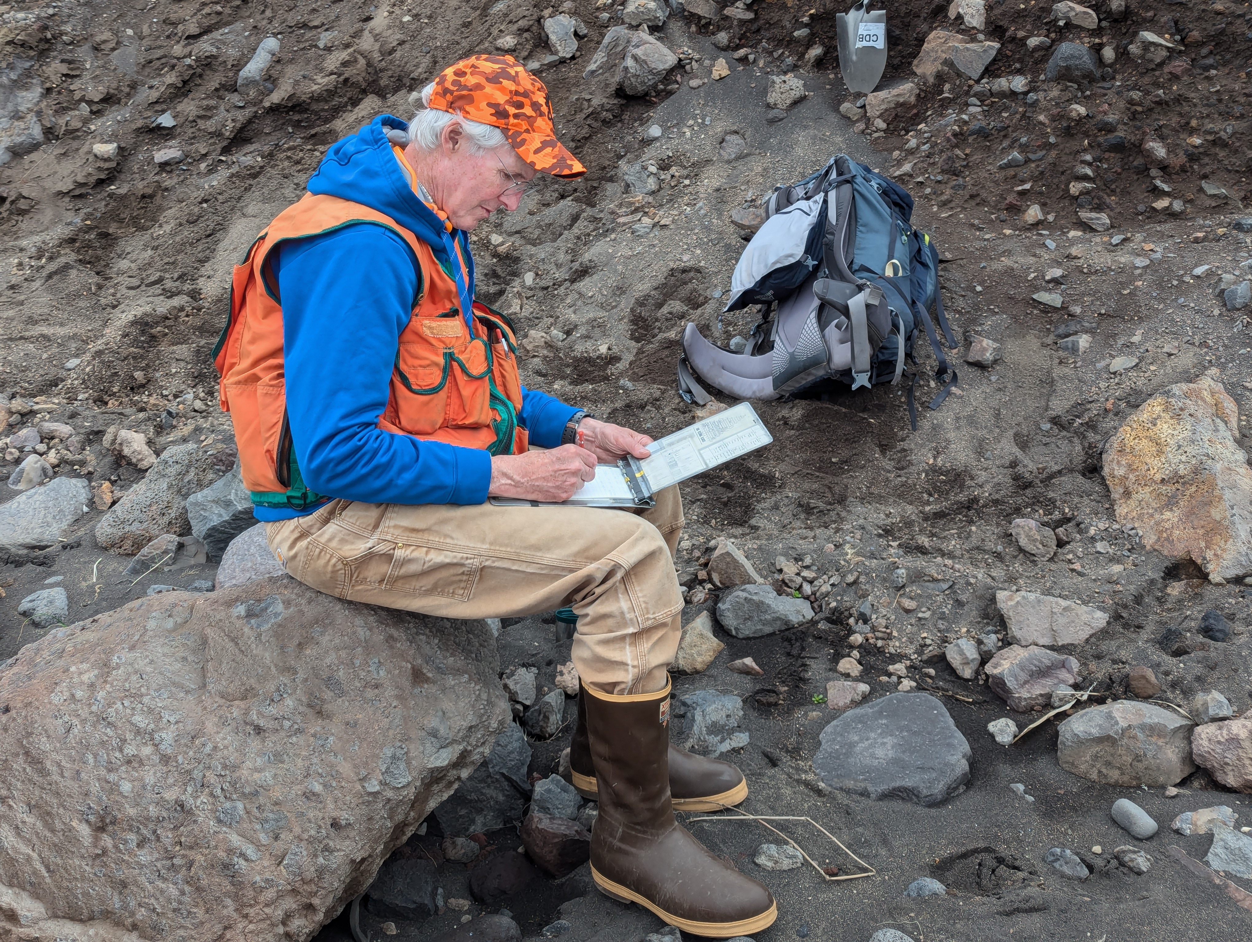 AVO geologists examine a coastal exposure at Lapin Cape, north of Shishaldin Volcano, during the 2024 summer fieldwork on Unimak Island.