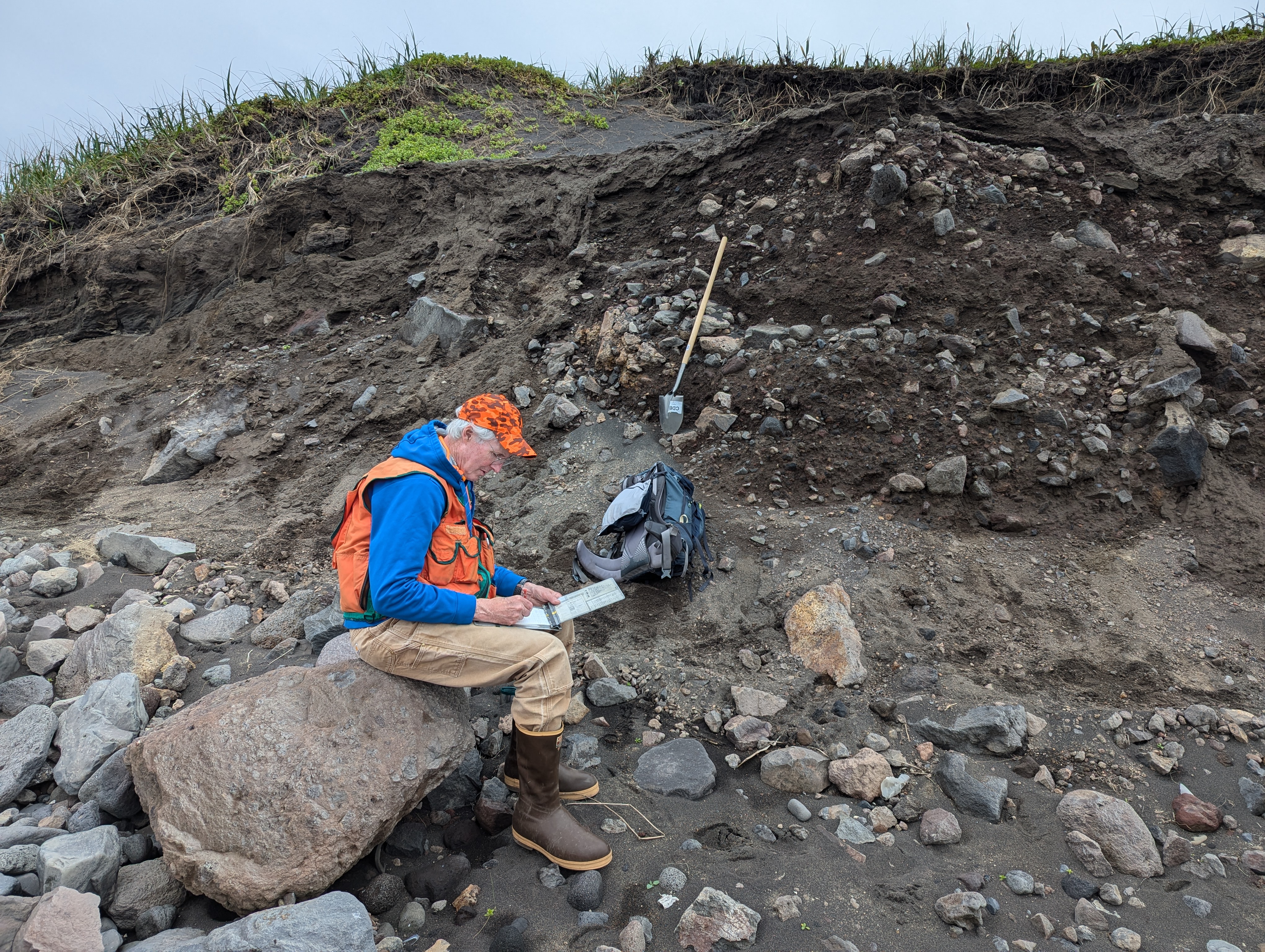 AVO geologists examine a coastal exposure at Lapin Cape, north of Shishaldin Volcano, during the 2024 summer fieldwork on Unimak Island.