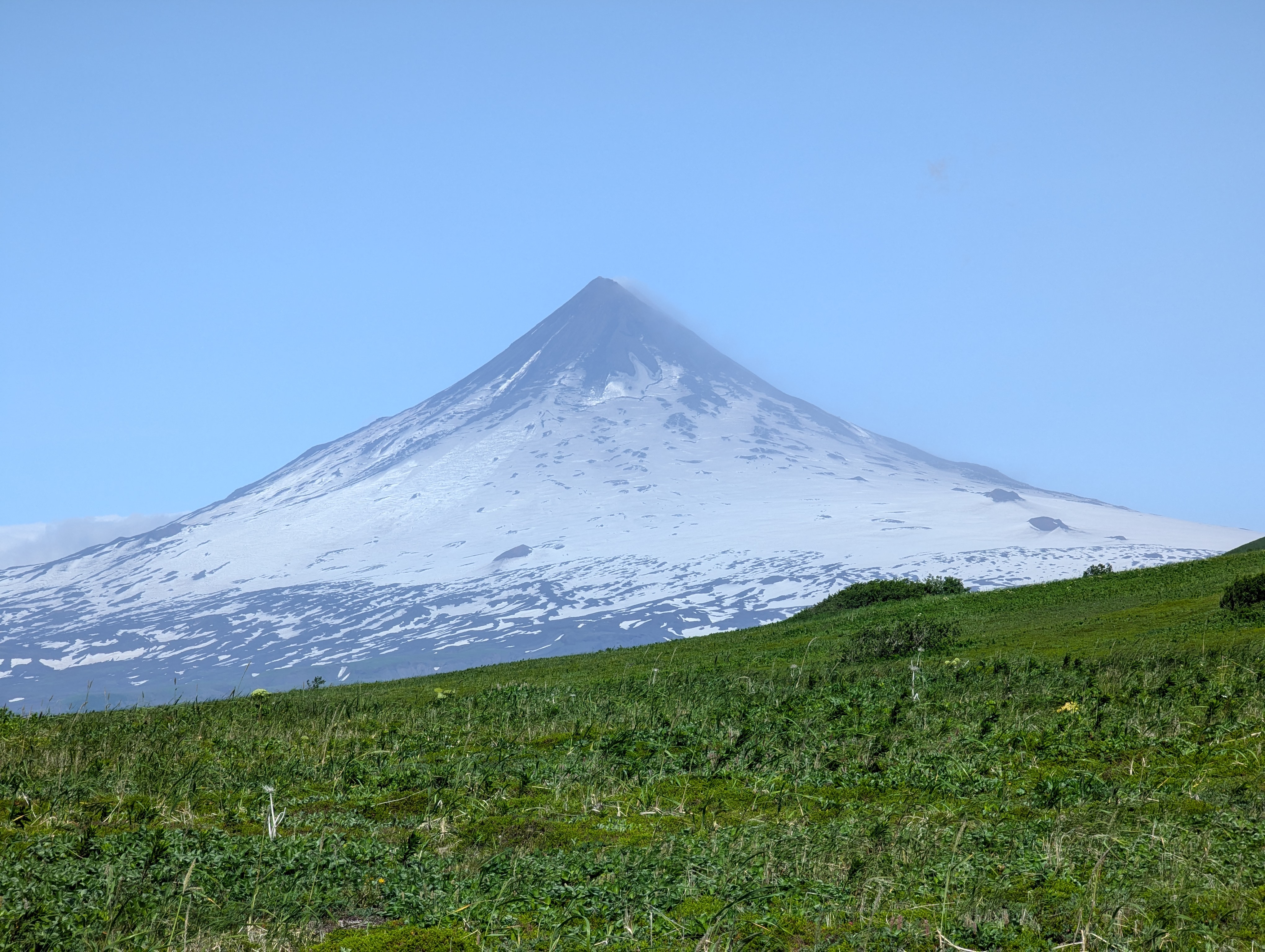 View of Shishaldin Volcano from the east on July 29, 2024, captured during AVO fieldwork on Unimak Island.
