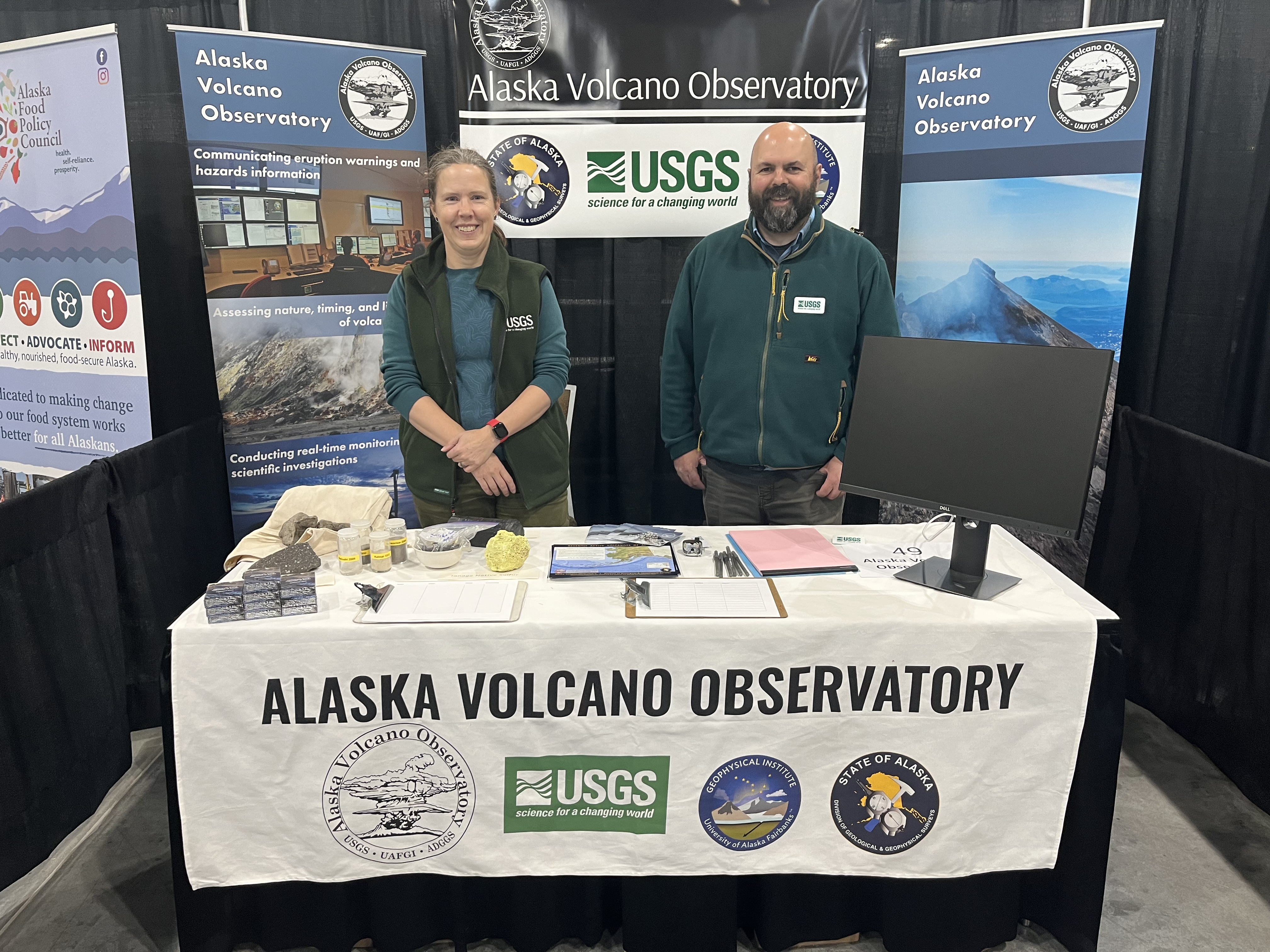 Alaska Volcano Observatory exhibit booth set up at Alaska Federation of Natives 2024 conference, October 16 2024.