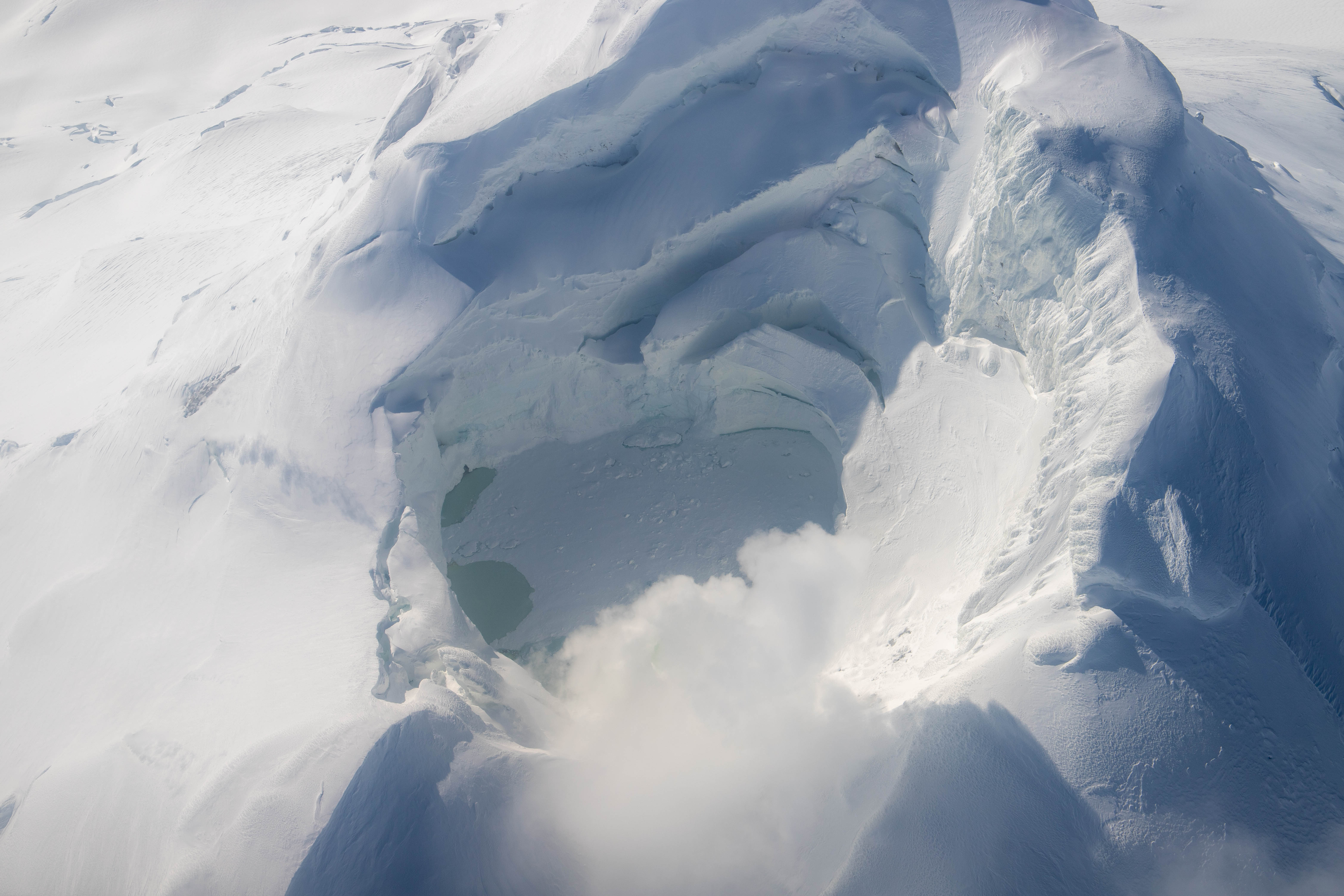 Lake inside of the Mount Spurr summit crater with fumaroles and discolored water on March 21, 2025. Much of the lake surface is covered in snow and ice.