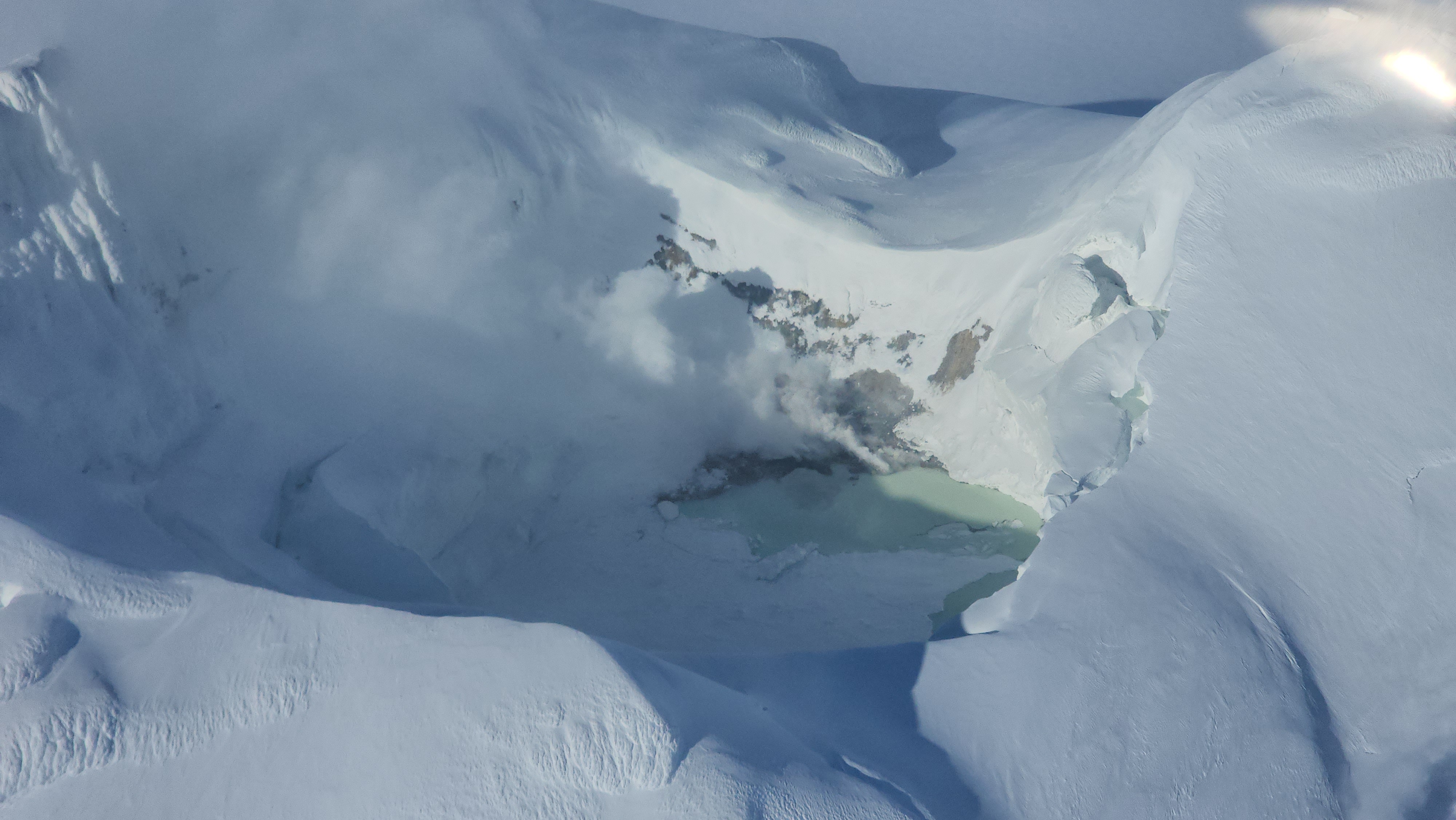 View of Mount Spurr summit crater lake, taken March 21, 2025. Steam is rising from the fumaroles on the shore of the lake inside the summit crater and on the upper flanks.