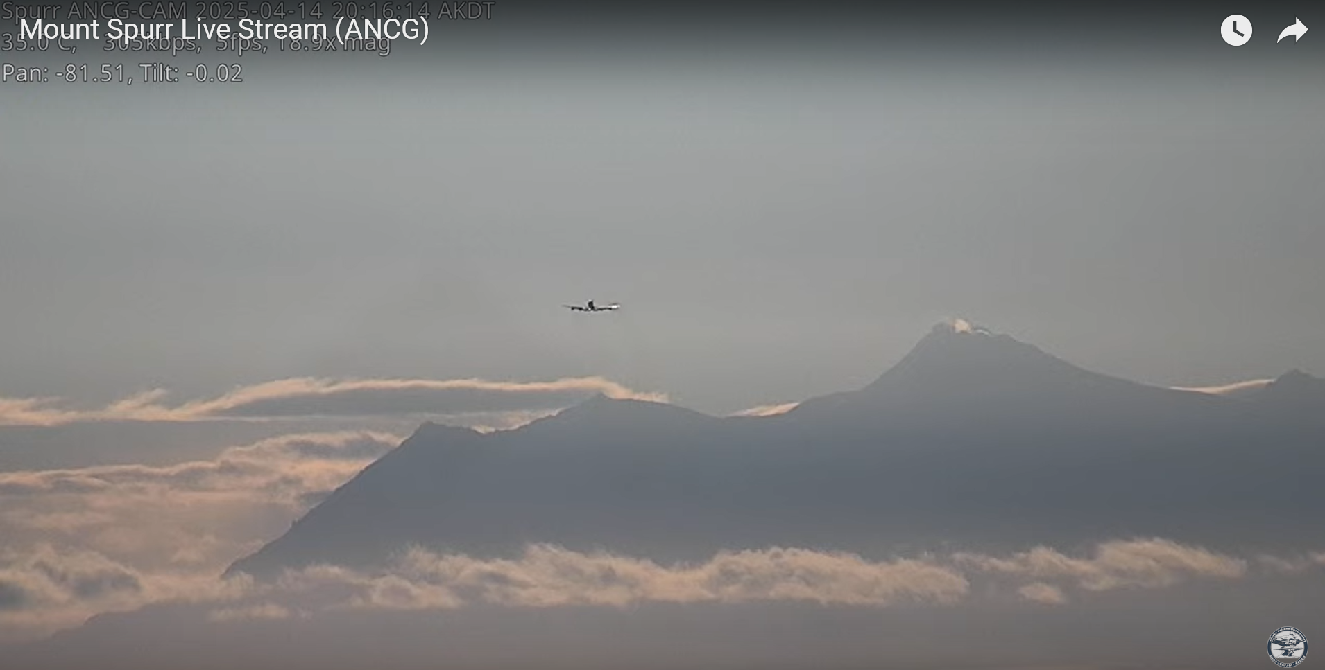 A screen capture of AVO's livestreaming Mount Spurr camera, ANCG, from April 14. A little steam is visible rising from Mount Spurr summit. A plane is also in view.