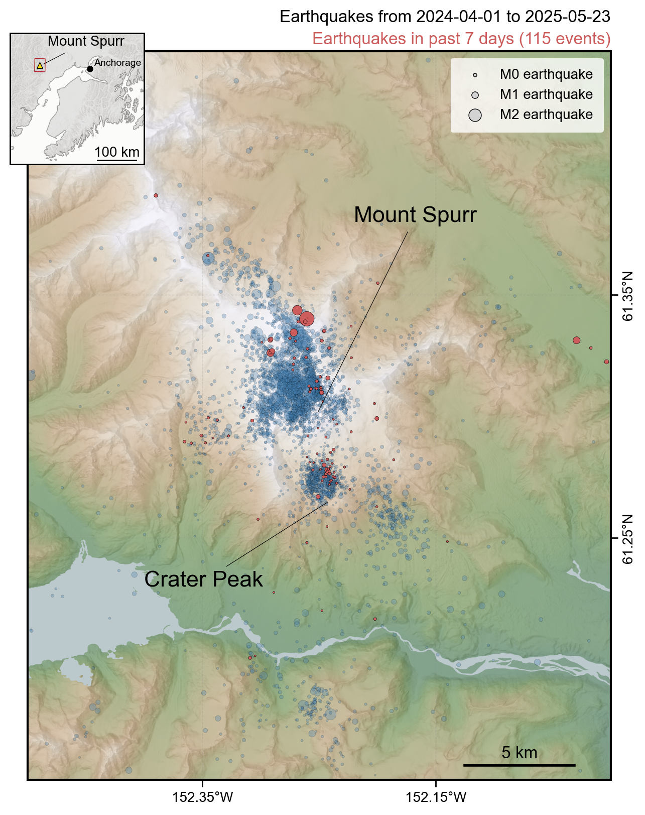Map showing all earthquakes recorded within 25 km of Mount Spurr during the current unrest period from April 1, 2024 to May 23, 2025. Earthquakes within the past week (May 16-23) are highlighted in red. Circles are scaled by earthquake magnitude.