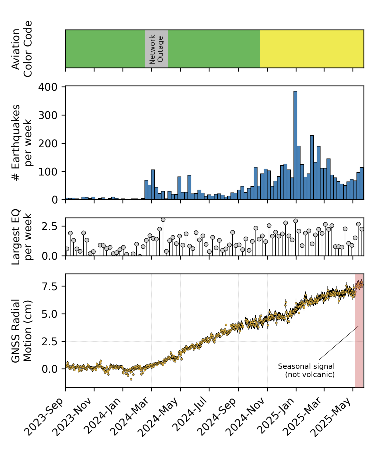 In August, earthquake numbers continued to decline, ground deformation remained paused, and steaming remained minor. Gas emissions were still present, but decreased. On August 20, 2025, AVO lowered the Volcano Alert Level to NORMAL and the Aviation Color Code to GREEN, stating: