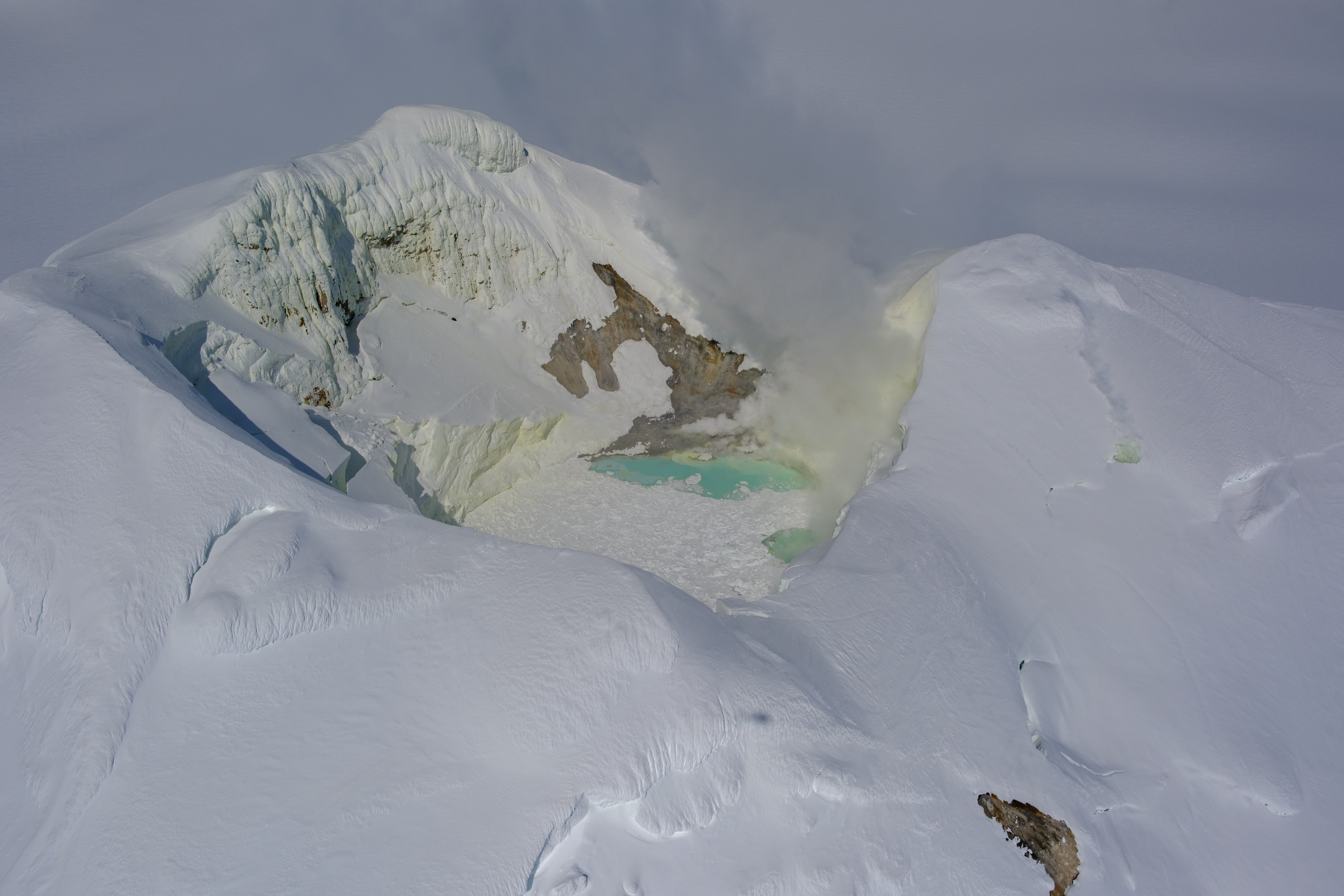 Summit crater of Mount Spurr on May 23, 2025. Gas emissions are visible from steaming fumaroles, primarily on the north shore of the crater lake but also a location on the southeast shore and several smaller fumaroles on the upper flanks. The lake continues to have floating ice from ongoing collapse of ice on the inner crater walls, and is a blue-green color. Sulfur staining is visible on the snow inside the crater.
