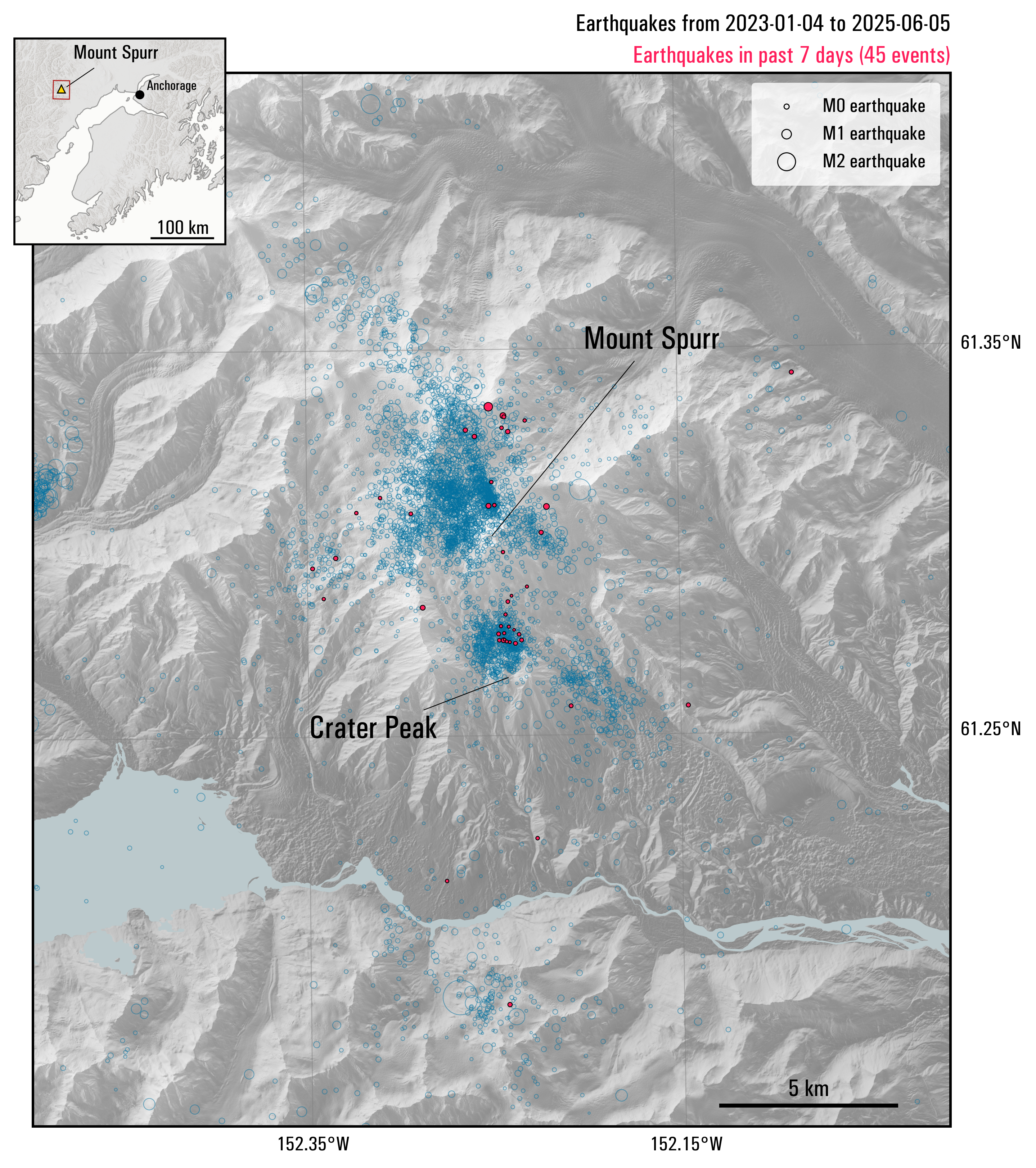 Map showing all earthquakes recorded within 25 km of Mount Spurr during the current unrest period from April 1, 2024 to June 5, 2025. Earthquakes within the past week (May 30-June 5) are highlighted in red. Circles are scaled by earthquake magnitude.