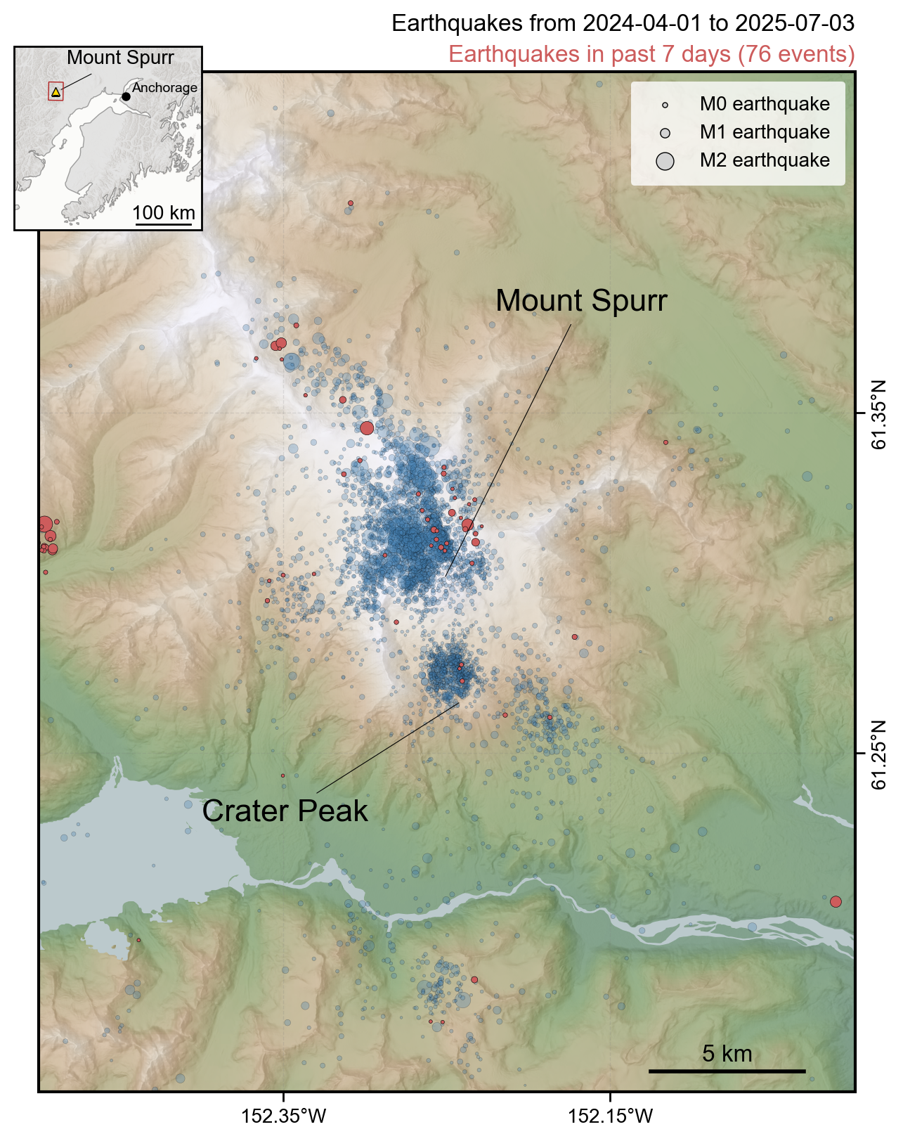 Map showing all earthquakes recorded within 25 km of Mount Spurr during the current unrest period from April 1, 2024 to July 3, 2025. Earthquakes within the past week (June 27 - July 3) are highlighted in red. Circles are scaled by earthquake magnitude.