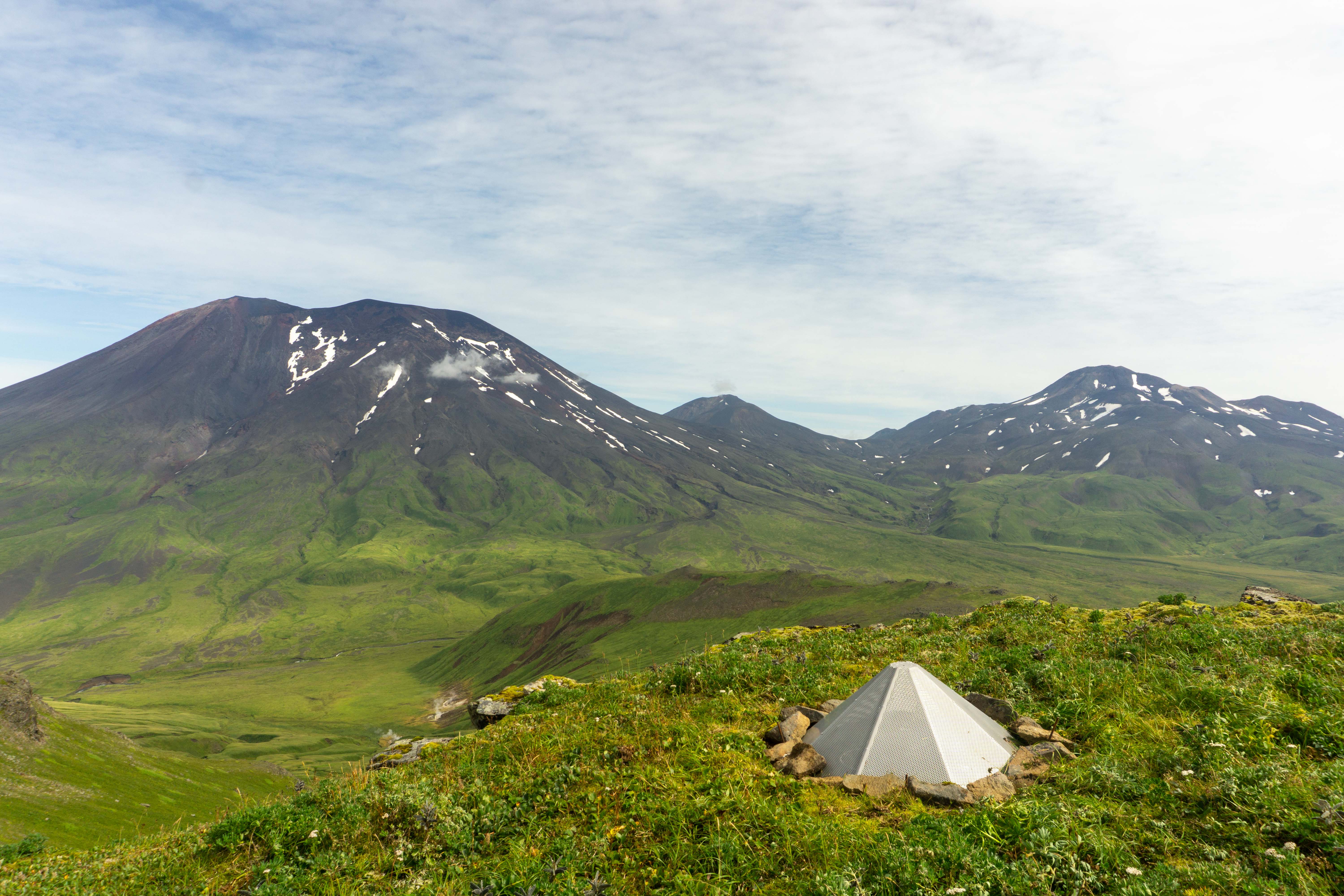 Korovin (left) and Kliuchef (right) volcanoes in the Atka Volcanic Complex viewed from station KOWE. Infrasound sensor is located in the foreground.