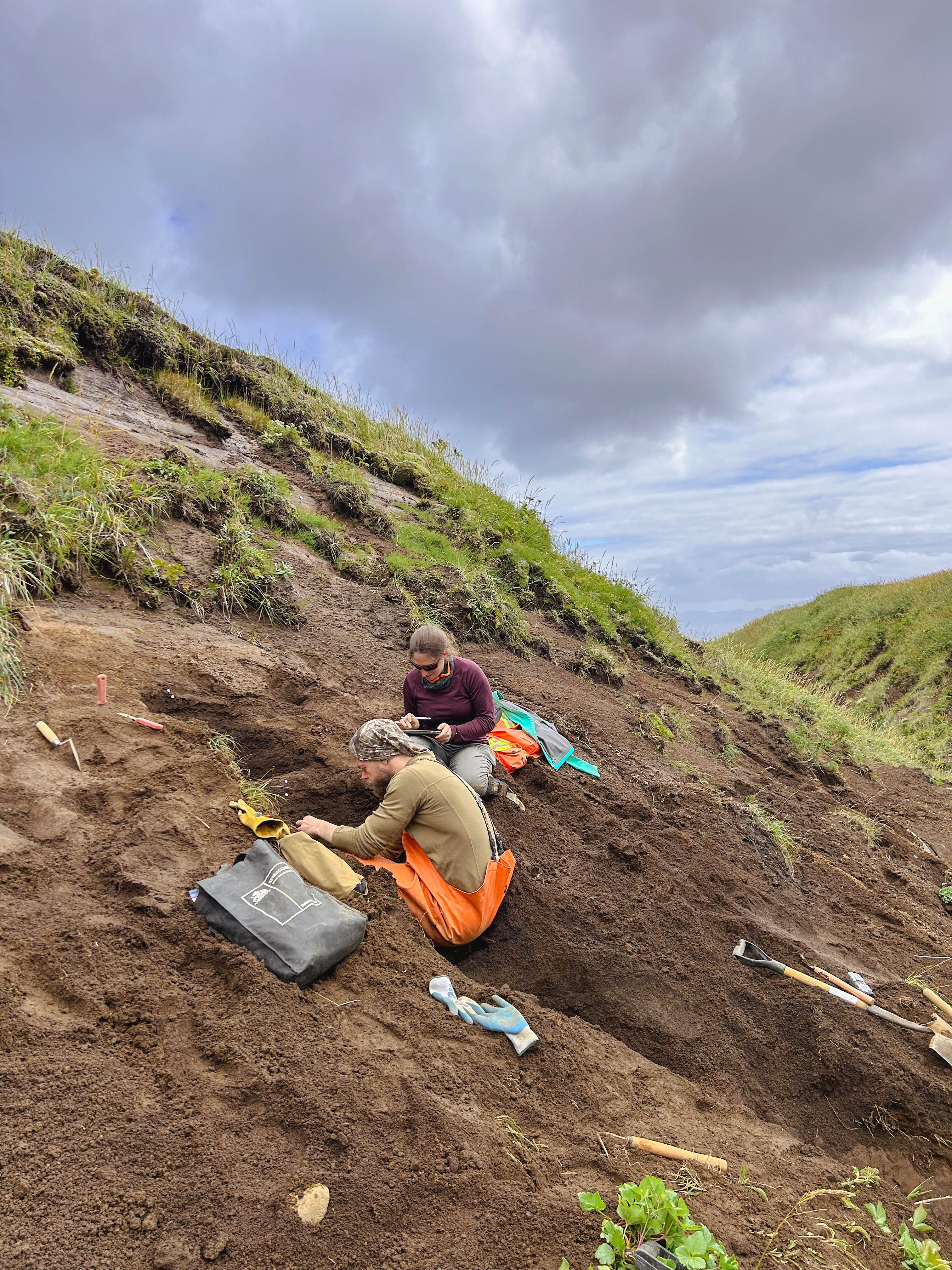 AVO geologists Hannah Dietterich and Jordan Lubbers work at tephra site 25AASHD003, on the south flank of Sarichef Peak. Photo taken during field work at Atka volcanic complex, northern Atka Island.