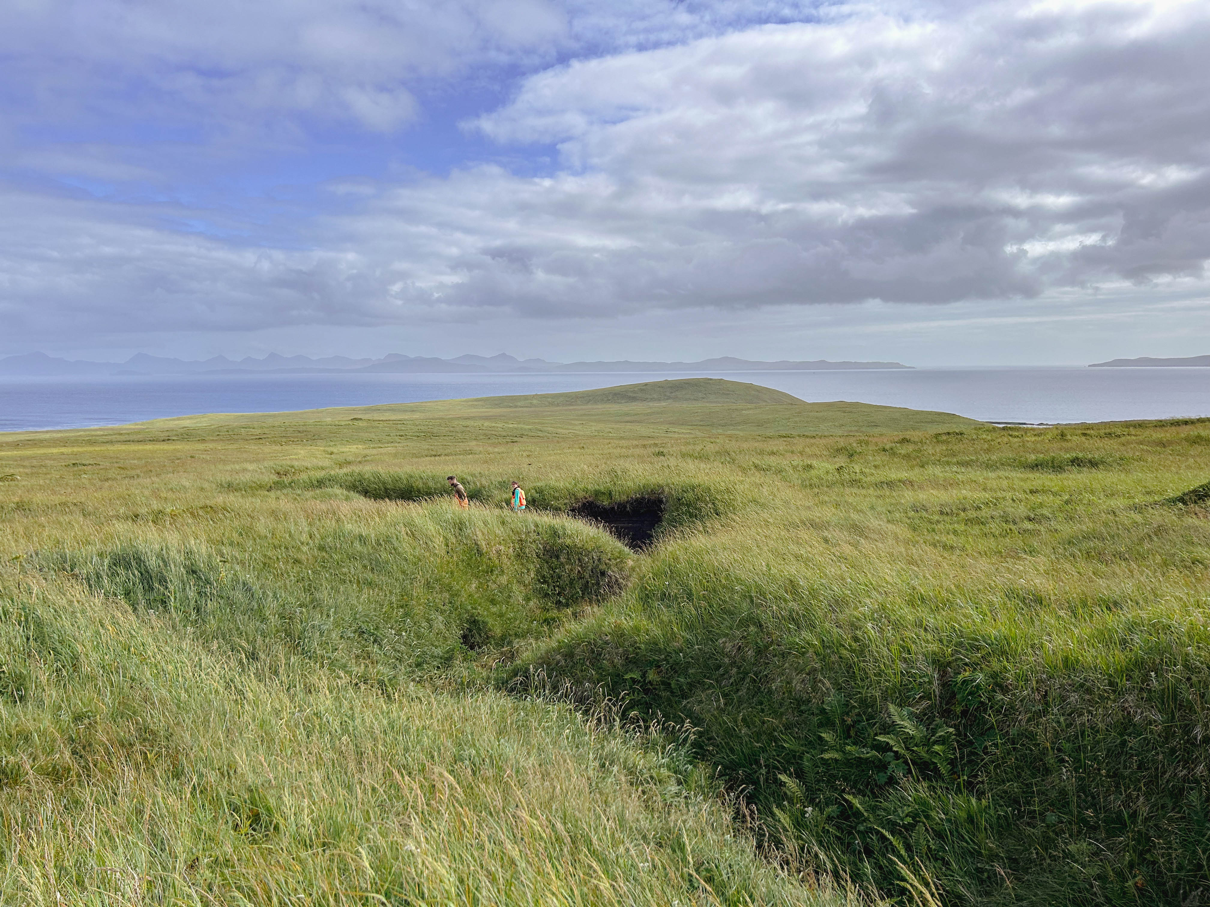 AVO geologists Hannah Dietterich and Jordan Lubbers at tephra site 25AASHD011, near the southern coast of northern Atka Island. Photo taken during field work at Atka volcanic complex, northern Atka Island.