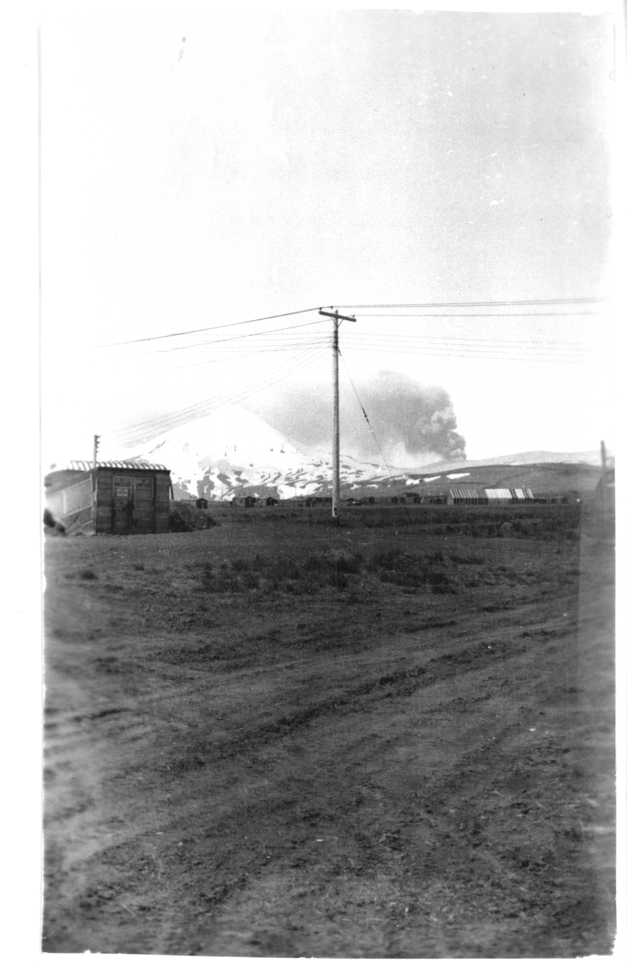 Photograph of Okmok volcano in eruption in June, 1945, as viewed from outside the caldera. Photograph courtesy of Harold Frederick Hill, then stationed at Fort Glenn as a radio operator, and his son, Allen Hill who shared the photograph with AVO. The prominent peak in the foreground is Tulik, a deeply glaciated peak almost certainly not active within historic time.