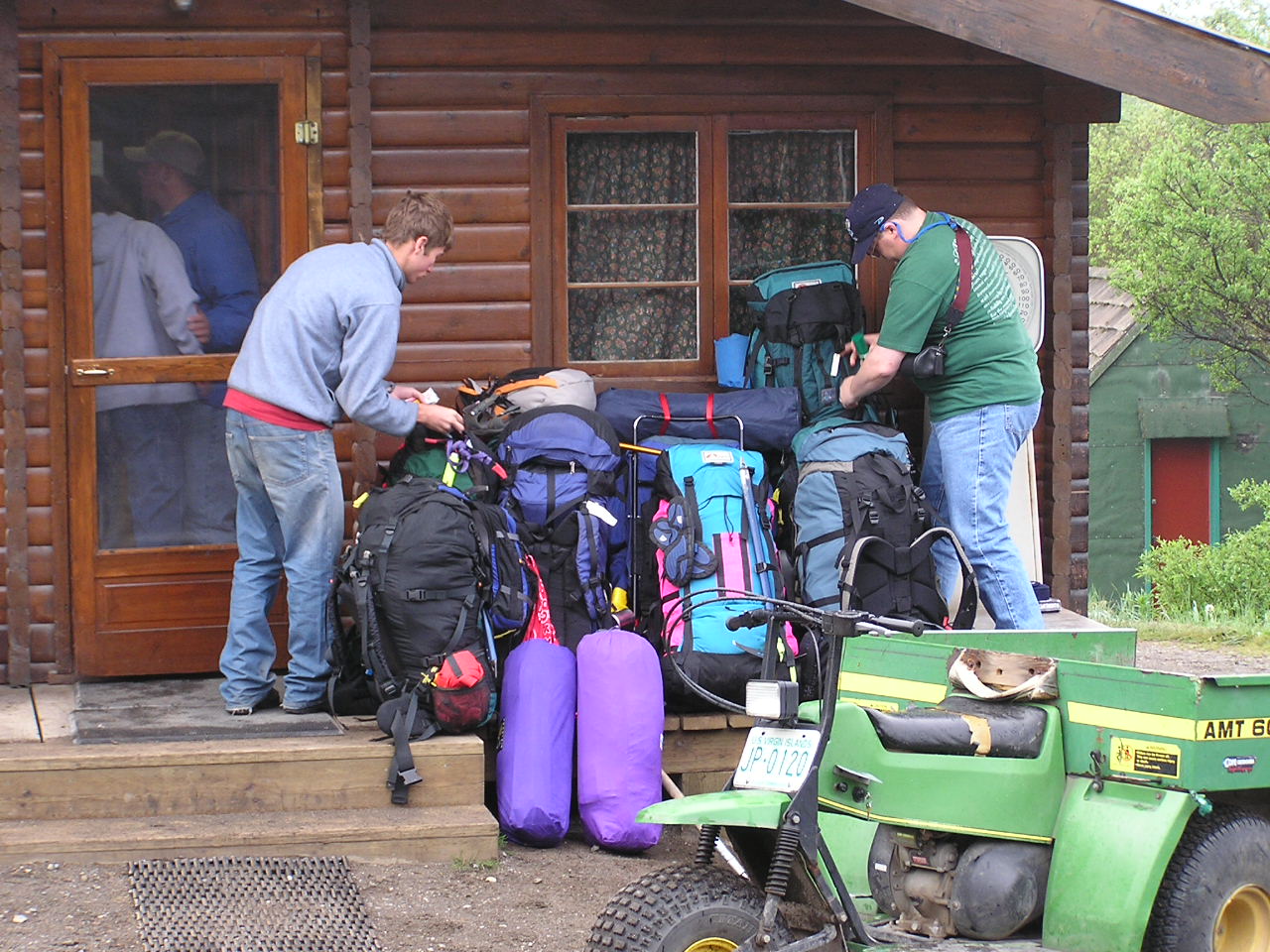 Gear storage near Brooks Lodge in Katmai National Park and Preserve just before the field party heads out to the bus to be transported to the trailhead. This was at the beginning of the 2003 Katmai Field Trip run by John Eichelberger - now part of the Katmai and Kamchatka Volcanology Field School.