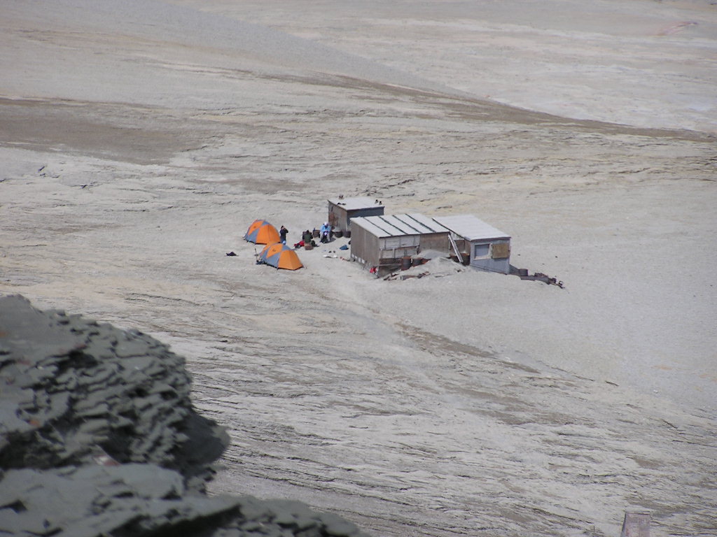 Baked Mountain huts, as seen from about half way up Baked Mountain, Valley of Ten Thousand Smokes, Katmai National Park and Preserve. These huts are about nine miles from the lower valley trailhead and are used as a base station for backpackers and scientists.
