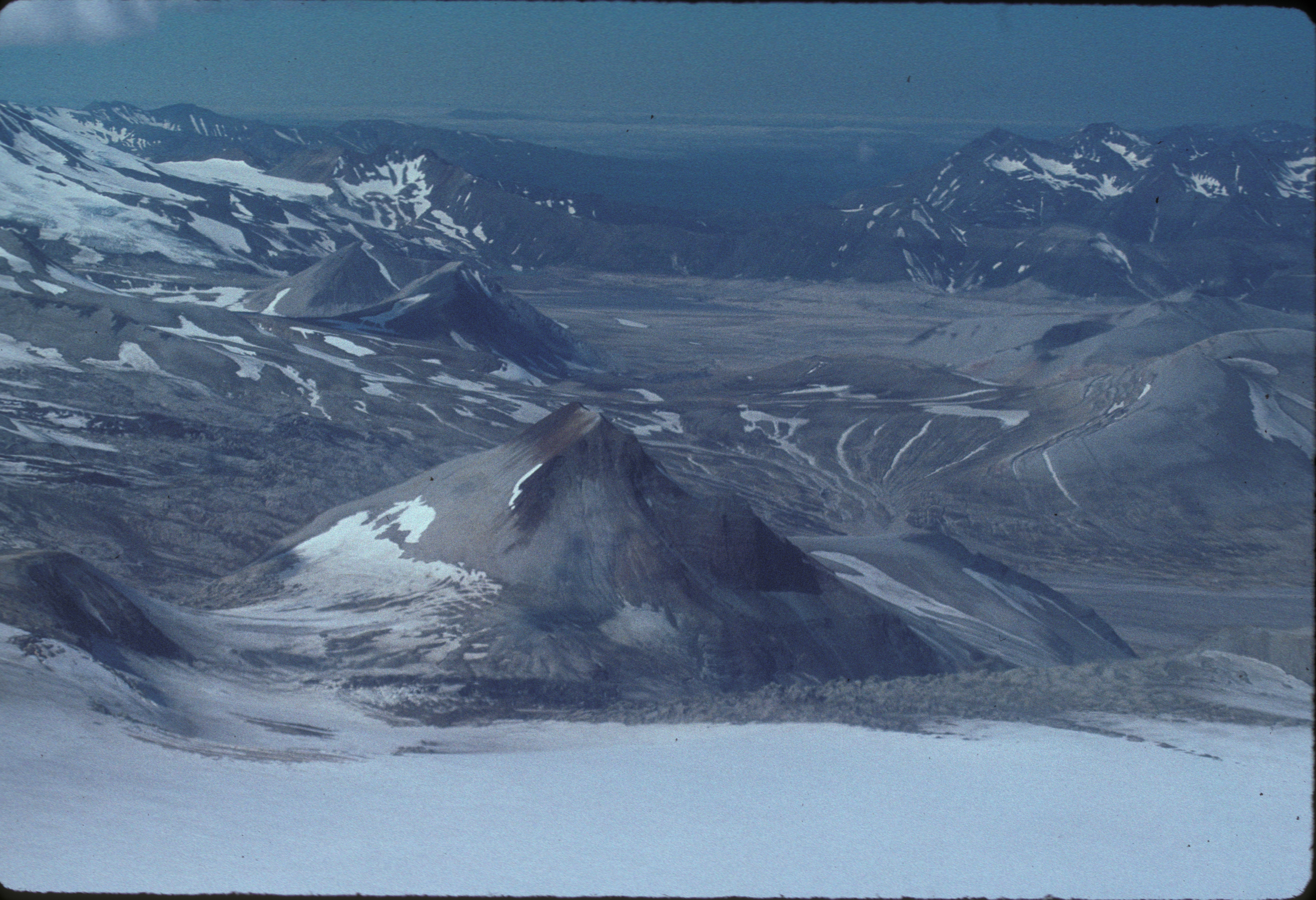 View of the upper Valley of Ten Thousand Smokes, looking west. The prominent feature in the foreground is Whiskey Ridge, composed of Jurassic-aged sedimentary rocks of the Naknek Formation. Two domes in the middle-right are Falling Mountain and Cerberus. Baked and Broken Mountains are visible on the right. In the basin in the center, the vent for the great eruption of 1912 is located, though Novarupta dome is not visible.