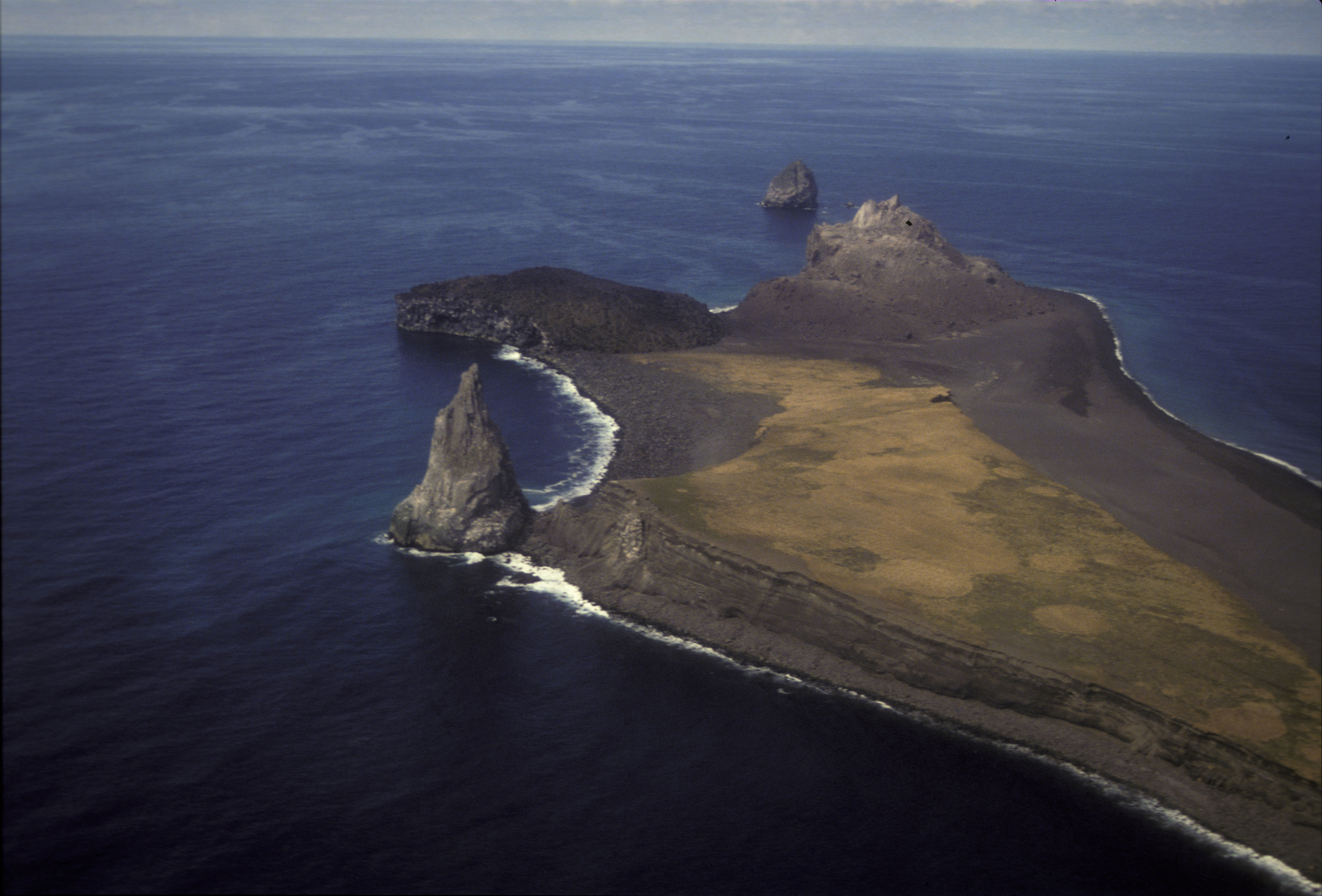 View from the southwest of the northern end of Bogoslof Island, and Fire Island just offshore to the north. Four lava domes are visible. the southernmost, a pinnacle along the west shore is Castle Rock (1796-1804). The flat-topped nearly circular dome is from 1927. The 1992 lava dome marks the far northern end of the island. Fire Island is a lava dome extruded during the 1883 eruption. The grassy terrace mid-island on Bogoslof is an accumulation of tephra deposits. Bogoslof and Fire Islands are the emergent summit of a submarine stratovolcano that rises 6000 feet from the floor of the Bering Sea.
