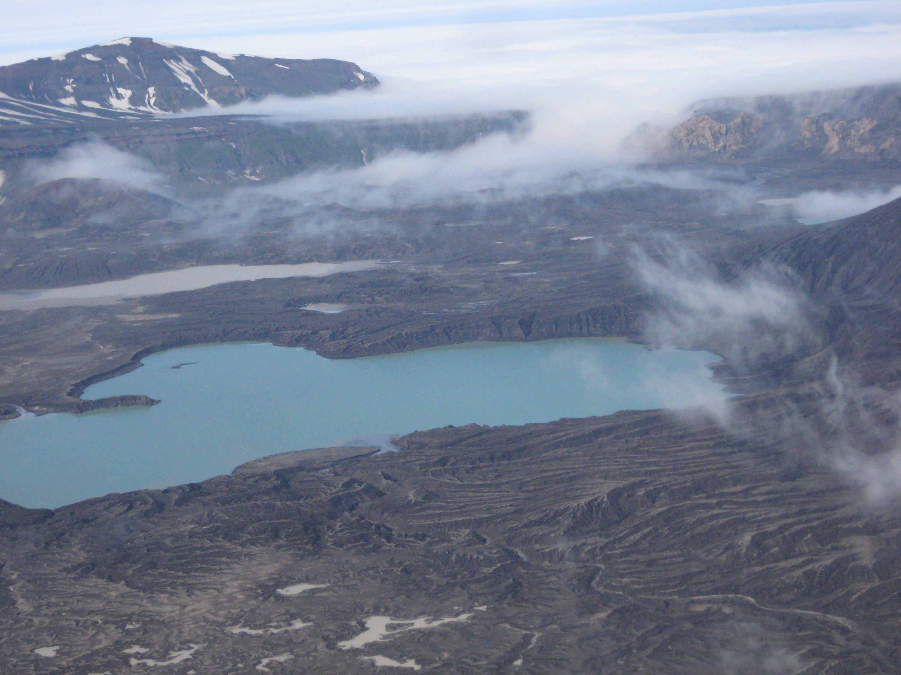 Okmok, 2010. View of Okmok caldera from the south. Note fog flowing through the Gates, muddy deposits, the lakes, and the new cone