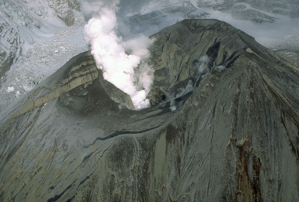 Aerial view of Crater Peak vent, Mount Spurr volcano. Following the three eruptions of 1992, the interior of Crater Peak was partially filled with pyroclastic debris to a thickness of more than 20 m (65 ft). A plume of steam and volcanic gas, at times vigorous, continued to emanate from the vent for several years. Photograph by C. Gardner, U.S. Geological Survey, September 26, 1992.