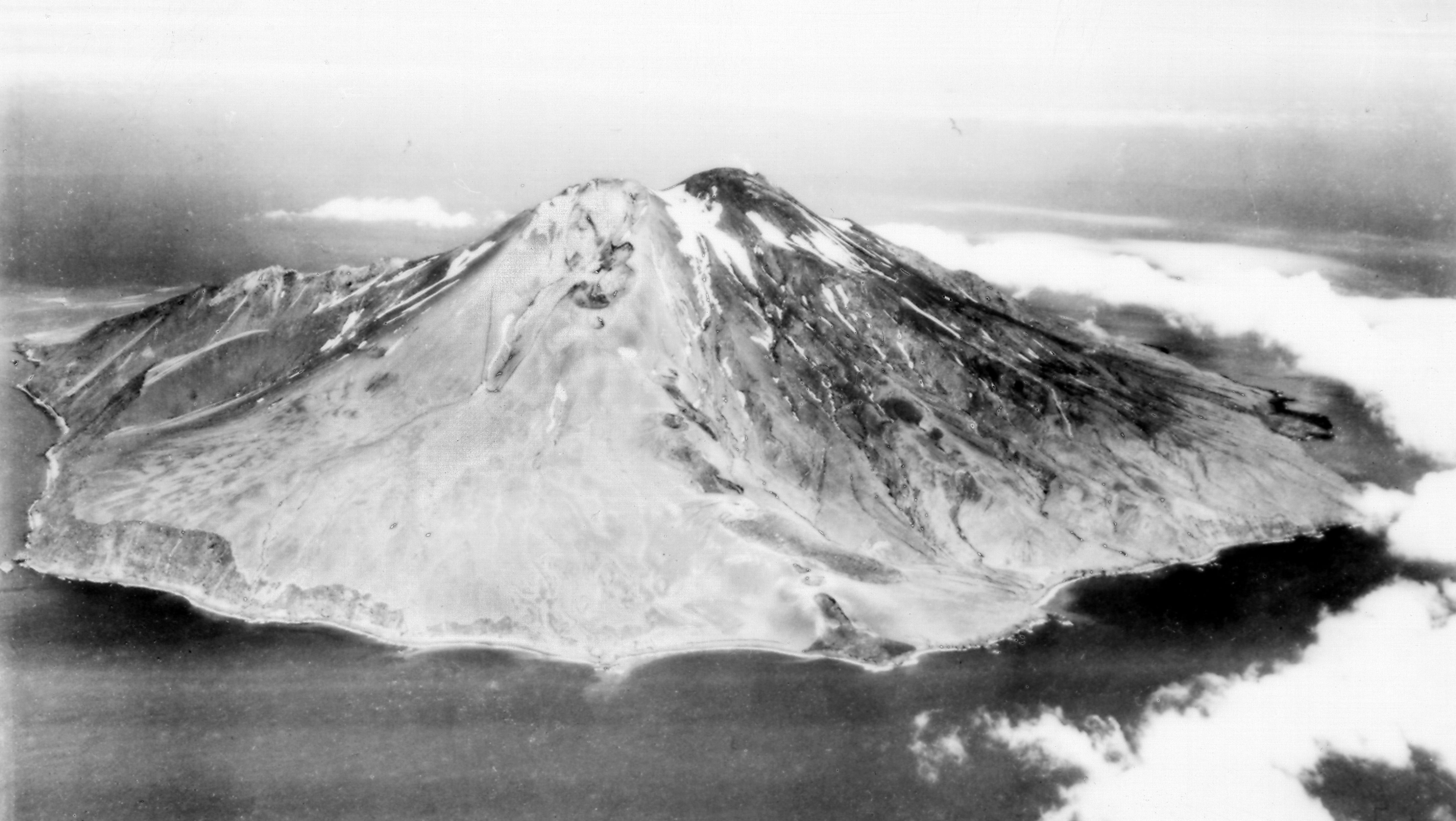 Low-oblique aerial view of Gareloi Island from the southeast, showing the fissure and craters of the eruption of 1929, and on the left, the high sea cliffs cut on the older lava flows.