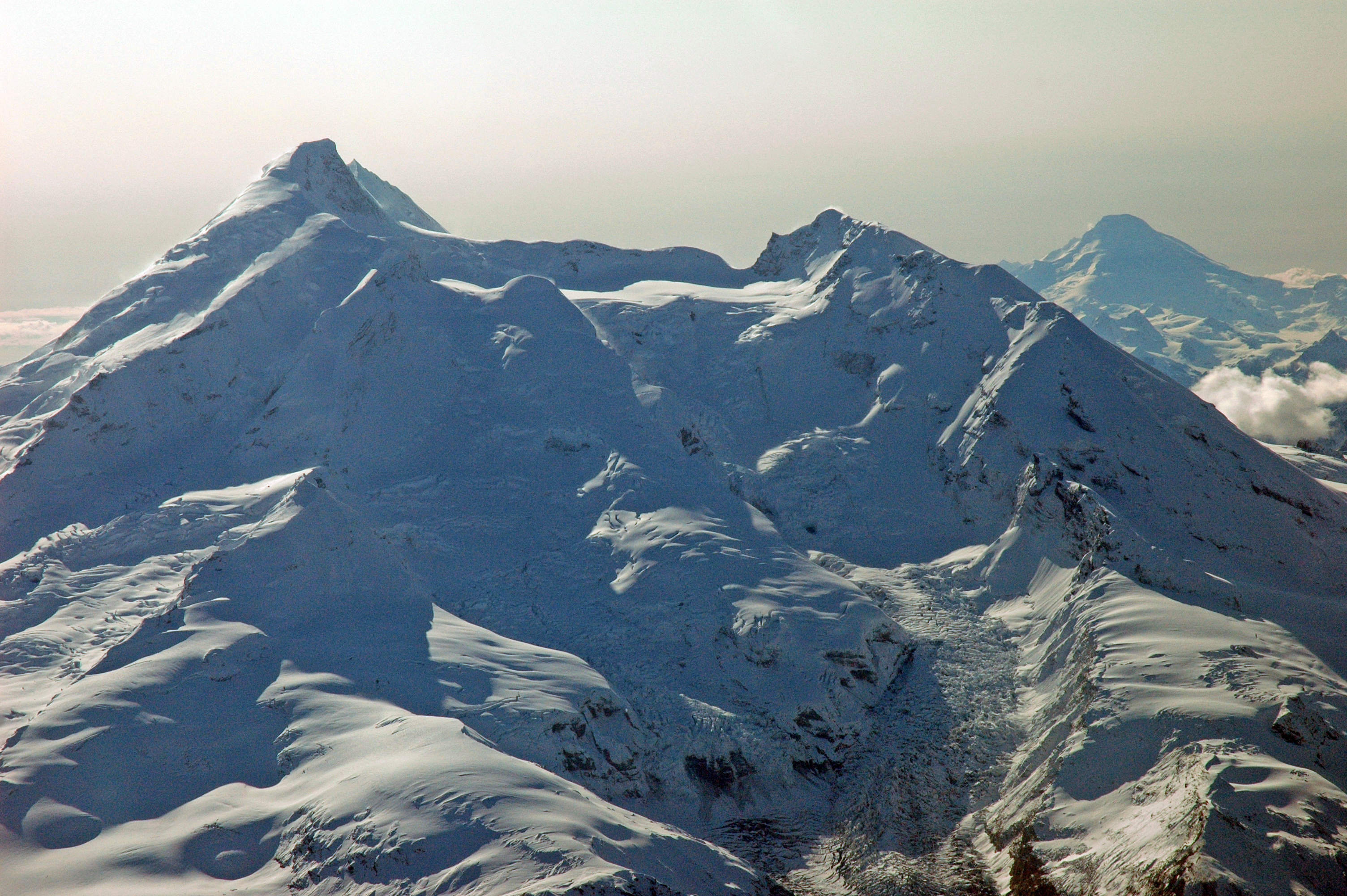 Aerial view from the north of Redoubt Volcano. The ice-filled summit crater is breached to the north and feeds Drift Glacier down the north flank. The 1990 dome is covered by crater ice, but recent thermal activity has melted several holes, exposing dome rock. Warm melt water flowing beneath the Drift Glacier has opened a skylight hole at the top of a waterfall located at the prominent break in slope.