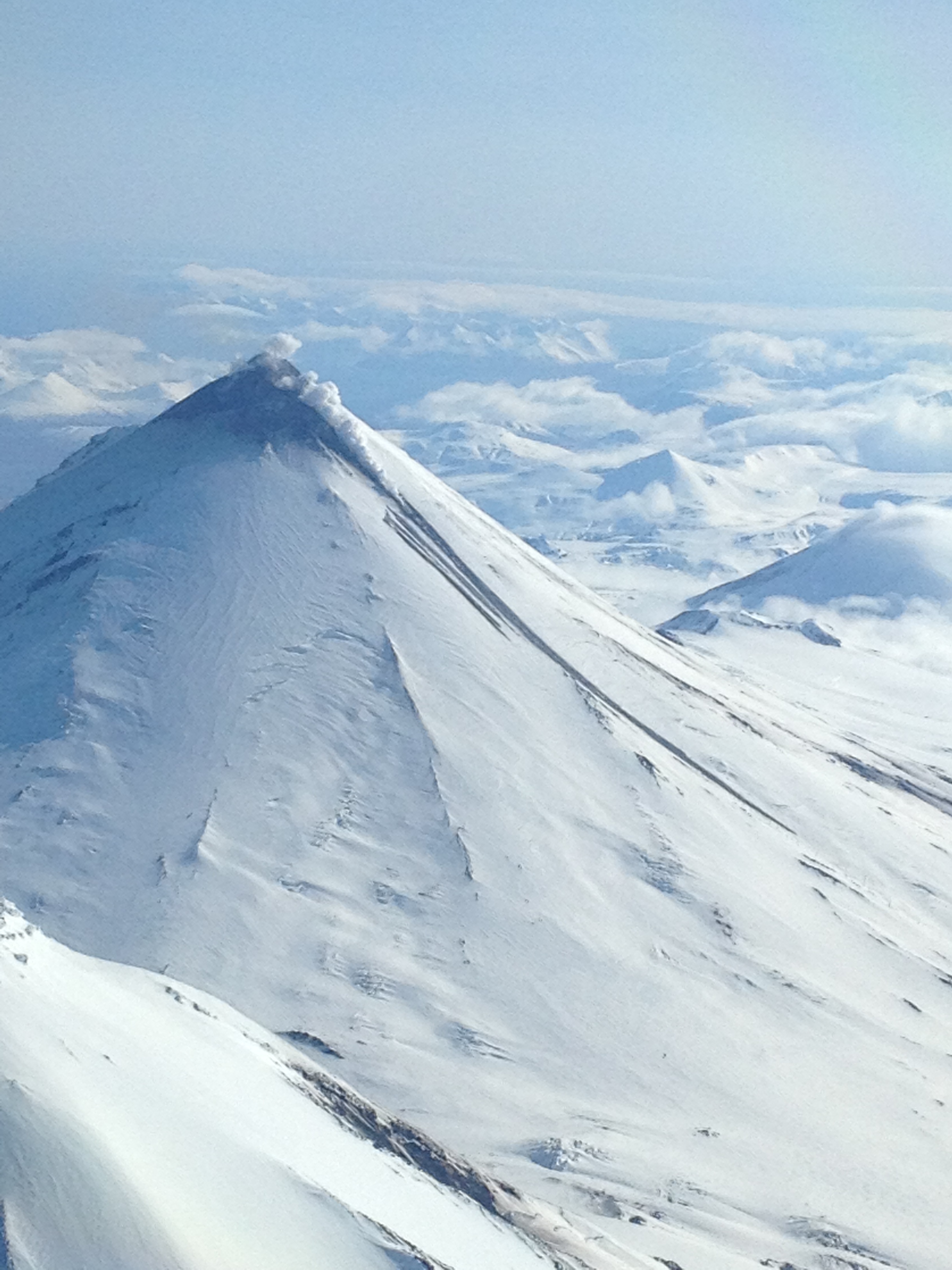 Photograph of Pavlof steaming, with fresh lava flow on its north flank. Photograph taken by Brandon Wilson at about 7 pm, May 13, 2013. Brandon was at about 10,500 feet, westbound from Sand Point to Cold Bay.