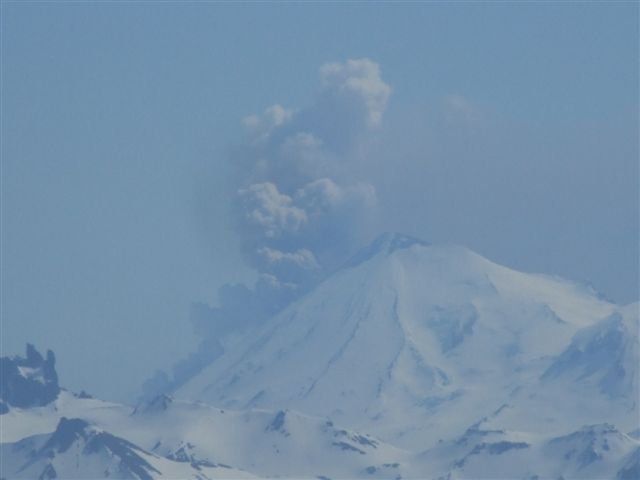 View of Pavlof's plume, about noon on May 14, 2013. Photograph courtesy of Jeffrey Doerning. Photograph taken from Cold Bay, which lies about 36 miles southwest of Pavlof).