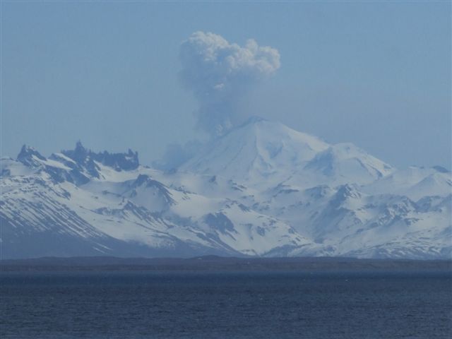 View of Pavlof's plume, about noon on May 14, 2013. Photograph courtesy of Jeffrey Doerning. Photograph taken from Cold Bay, which lies about 36 miles southwest of Pavlof).