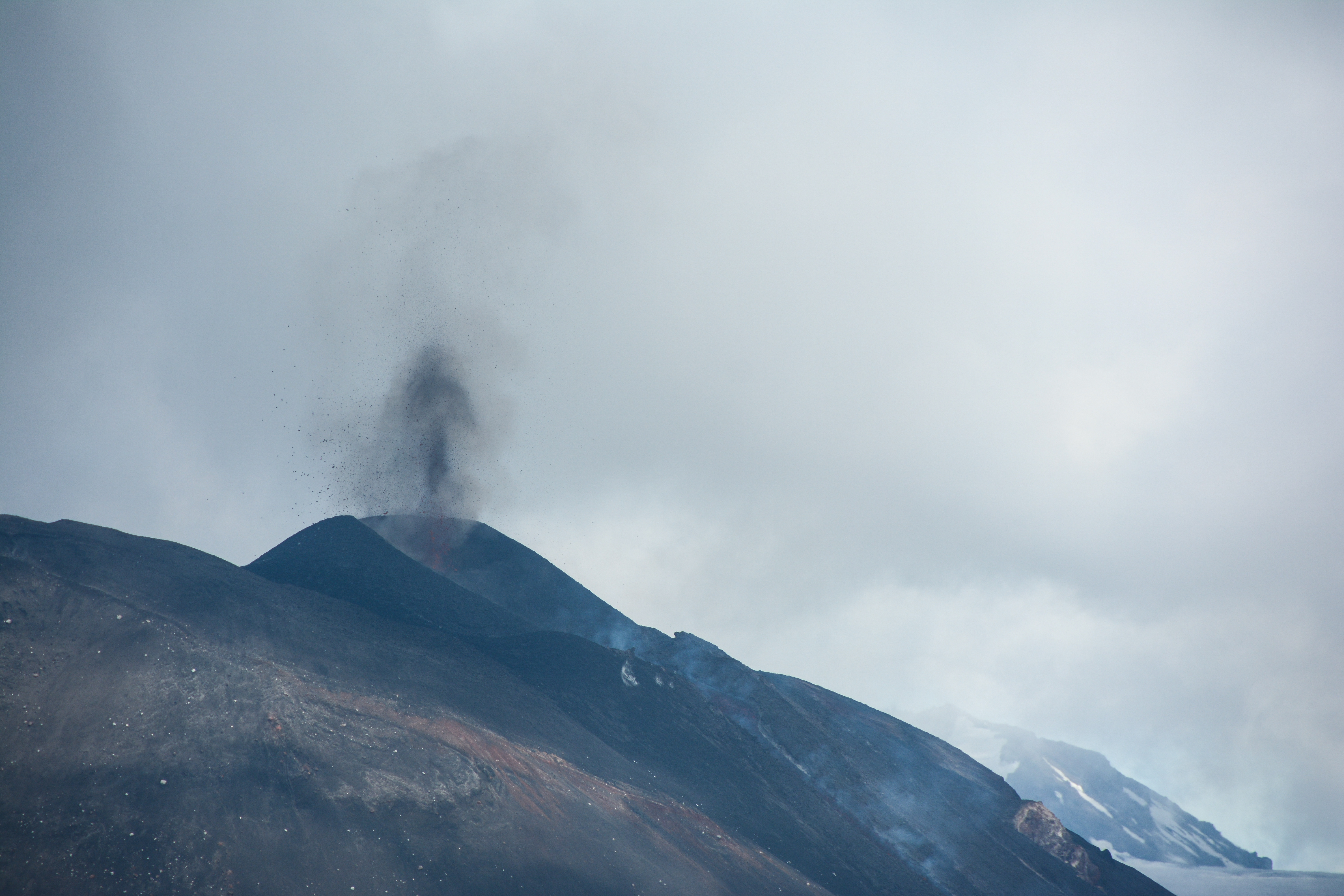 Low-level explosive burst of ash and spatter at the intracaldera cone of Veniaminof Volcano. View is toward the southeast.