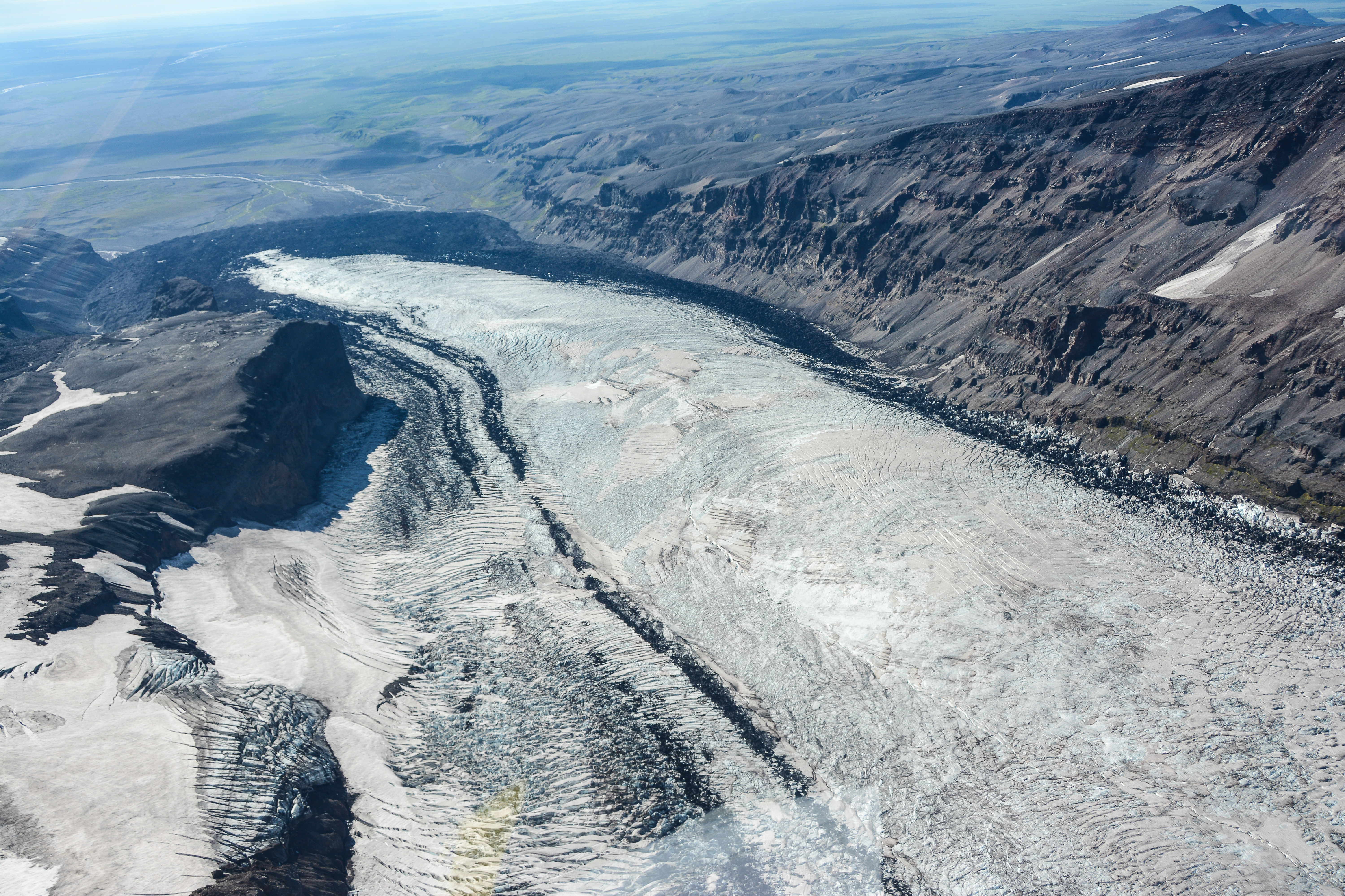 Cone Glacier on the north flank of Veniaminof Volcano. Examination of the glacier and areas downstream revealed no evidence for water outflow associated with July 2013 lava induced melting of the ice around the intracaldera cone. View is toward the north.
