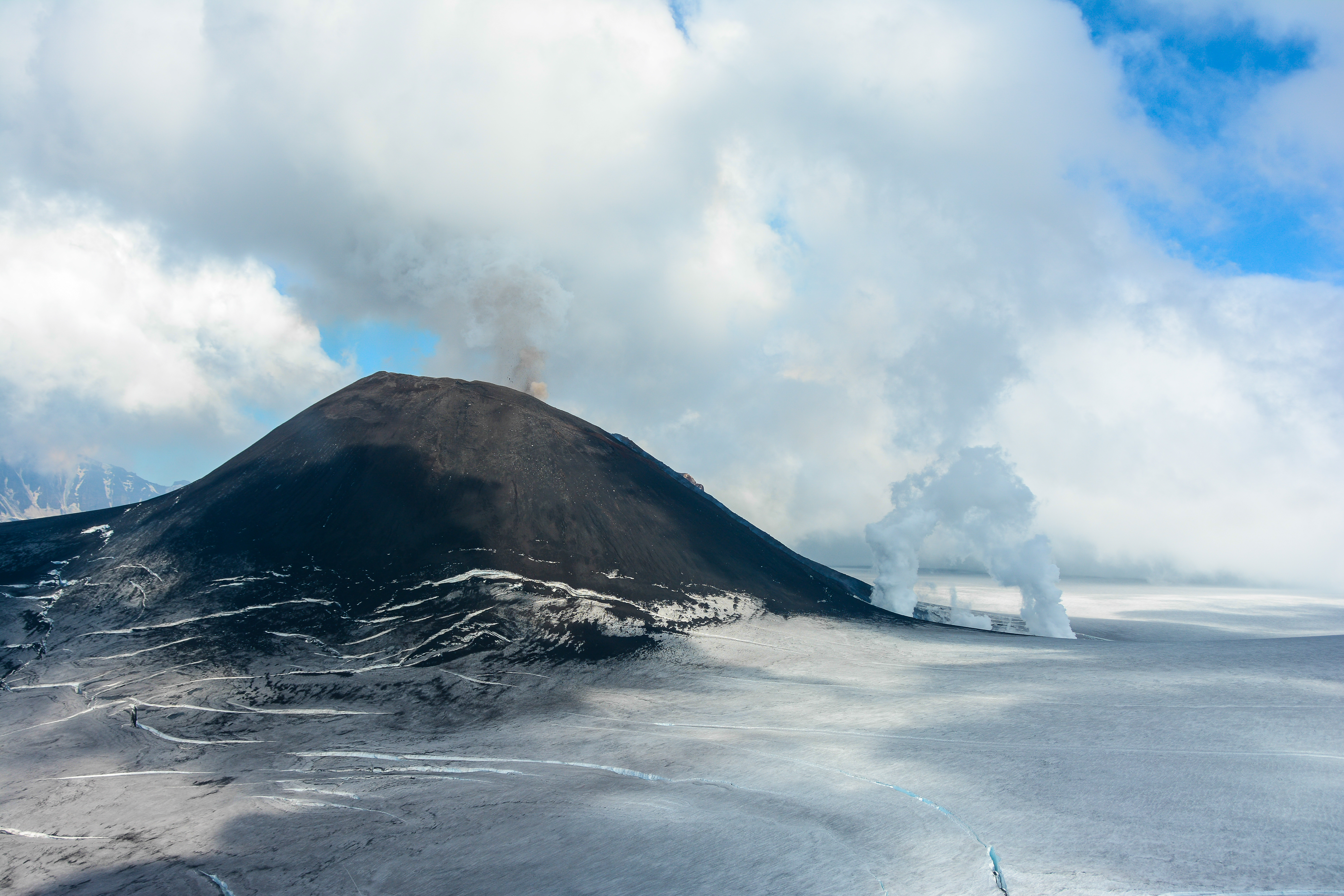 Intracaldera cone of Veniaminof Volcano and low-level eruption of ash and spatter and steaming lava flows within shallow melt depression on southwest flank of cone. View is toward the southeast and relief of cone above surrounding ice field is about 200 meters.