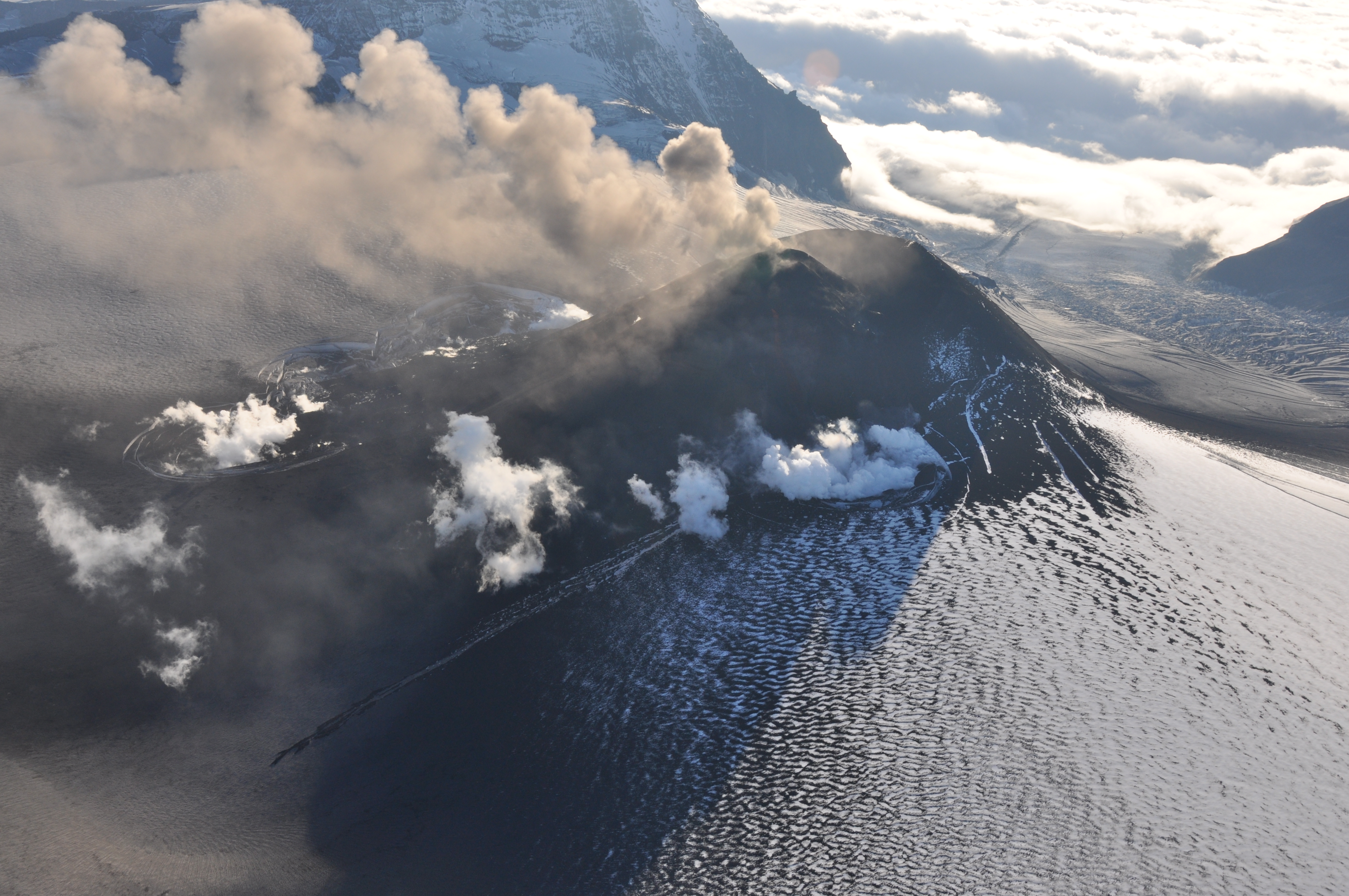 From Dixon and others (2015): "Mount Veniaminof Volcano is a frequently active volcano on the Alaska Peninsula. From 2002 through 2010, nearly continuous low-level eruptive activity waxed and waned, producing wispy plumes that were reported by pilots, recorded on satellite images, and observed in images from the Federal Aviation Administration (FAA) Web camera in Perryville, 35 km (22 mi) east of the volcano. Activity ceased during the first one-half of 2013. In early June 2013, a several-day period of abrupt and gradually increasing levels of seismic tremor heralded the onset of a largely effusive eruption from the intracaldera cinder cone (table 6 in original text). Over the next 5 months, ash emissions and Strombolian explosions accompanied by five lava flows poured down the flanks of the active cone and advanced onto the surrounding ice-filled caldera. This eruption constructed a new spatter cone within the summit crater of the main active cone (Waythomas, 2013).